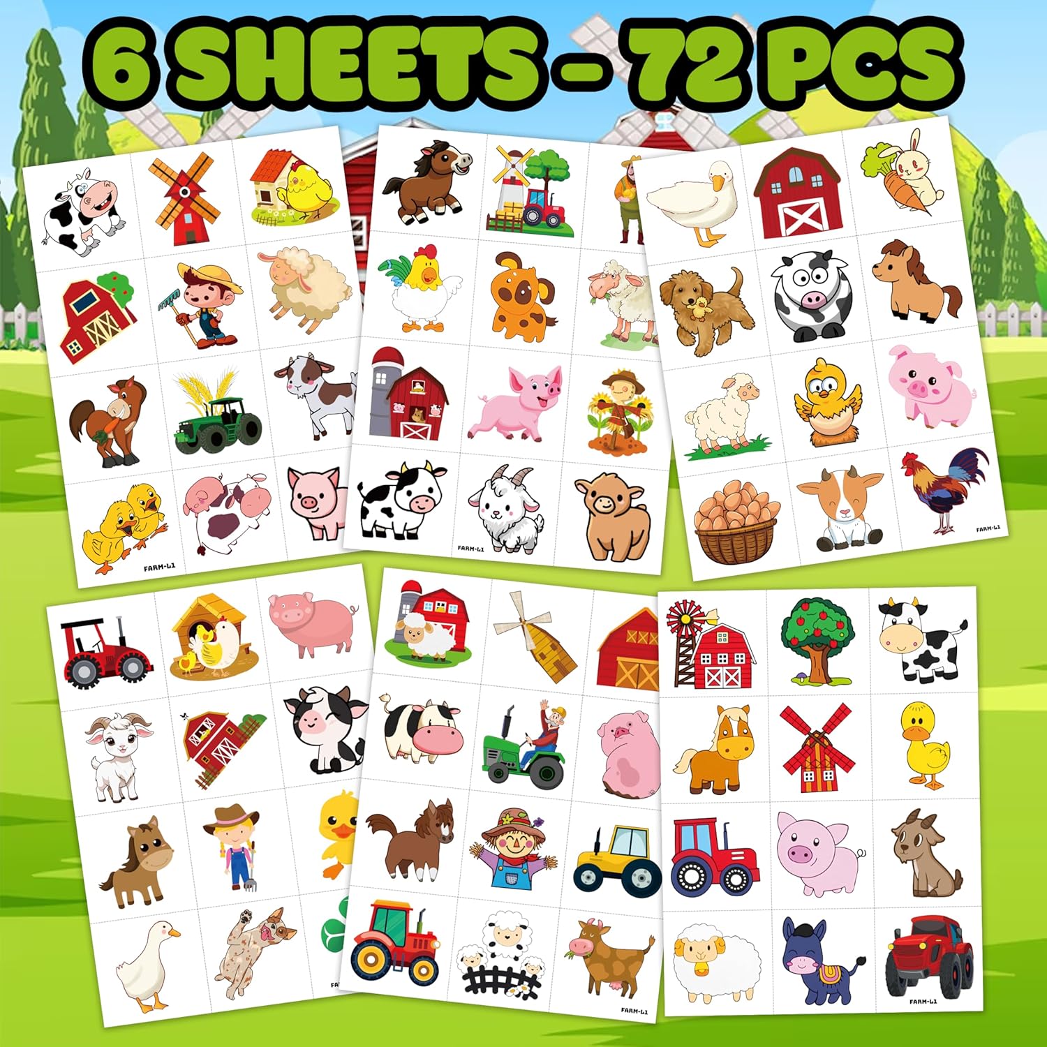 72 PCS Farm Barnyard Animal Pre-Cut Temporary Tattoos Sticker Birthday Decorations Party Supplies Favors Gift Boy Girl Farmhouse Cow Chicken Tattoo School Reward Themed (Normal)