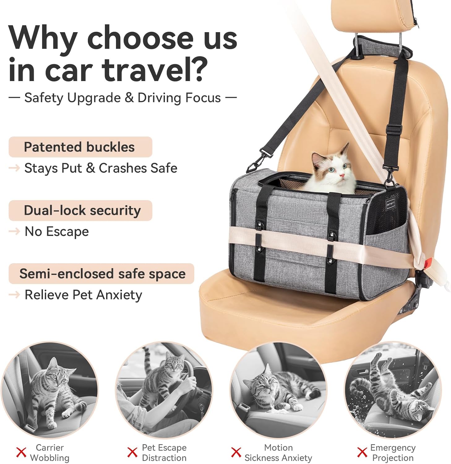 • Patented Safety Design: Featuring patented buckles and an adjustable clip-on harness, this cat car carrier ensures stability during car travel. It also includes an anti-loss safety rope and a lockable zipper to prevent pets from jumping out and distracting the driver