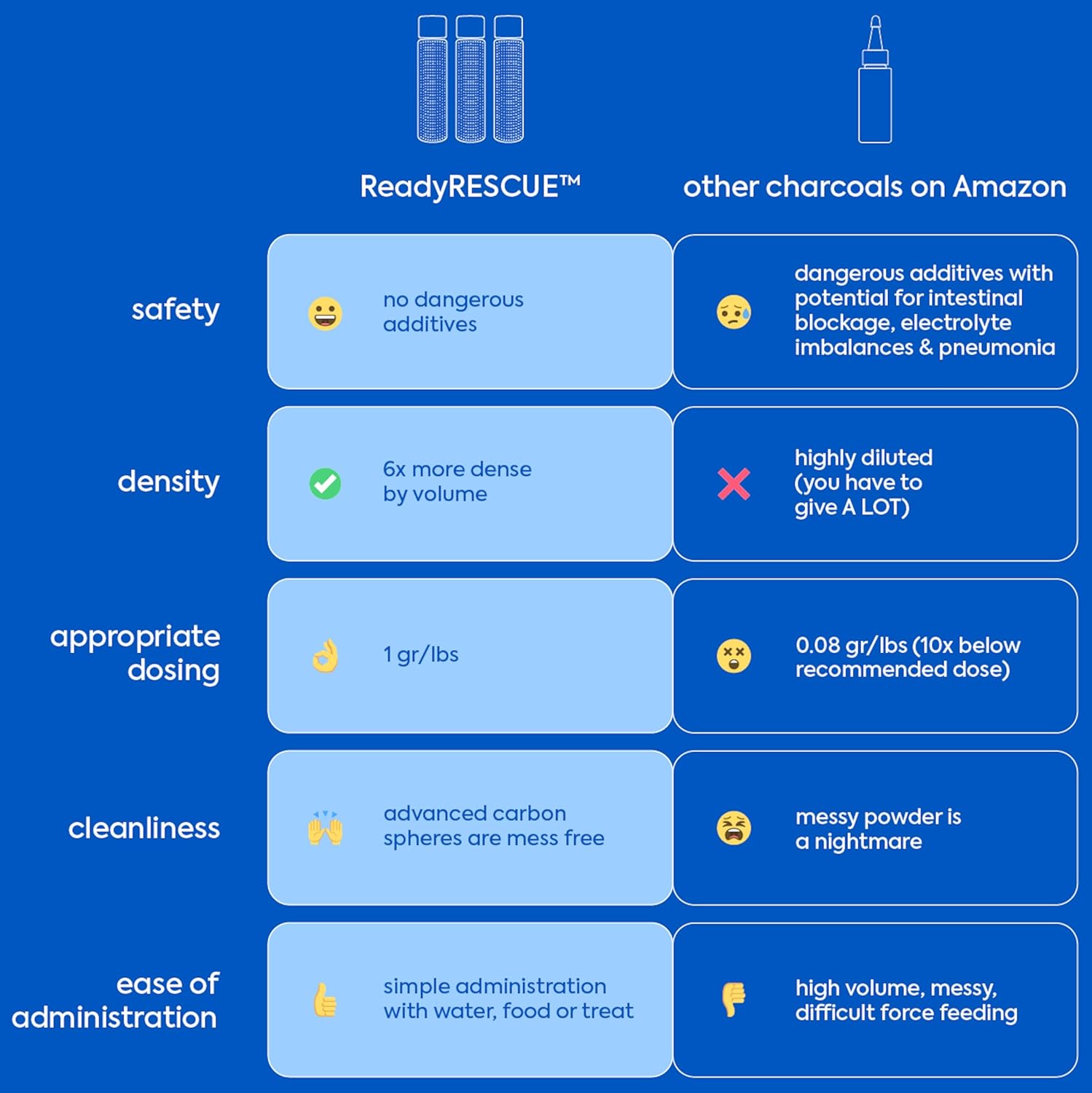 • SAFE AND RELIABLE: Worry less about accidental overdoses or false alarms. ReadyRESCUE is completely safe, even if poisoning isn't confirmed. It passes harmlessly through the GI tract absorbing potential poisons along the way, ensuring your pet's safety every time.