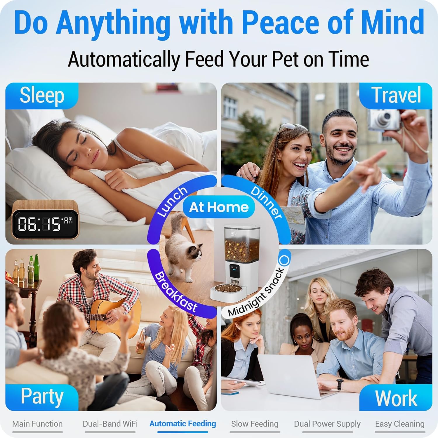 - Remote APP Control : The Automatic cat feeder can connect to 2.4GHz or 5GHz network. Program and monitor your pet's meals anywhere anytime through the โSmart Lifeโ App on your iOS or Android smartphone. You can set up a feeding schedule of up to 30 meals per day, with 1-12 portions per meal. Also reward your pet by feeding it remotely from outdoor via the app. The app can also check feeding records and share to family members' smartphones for control.