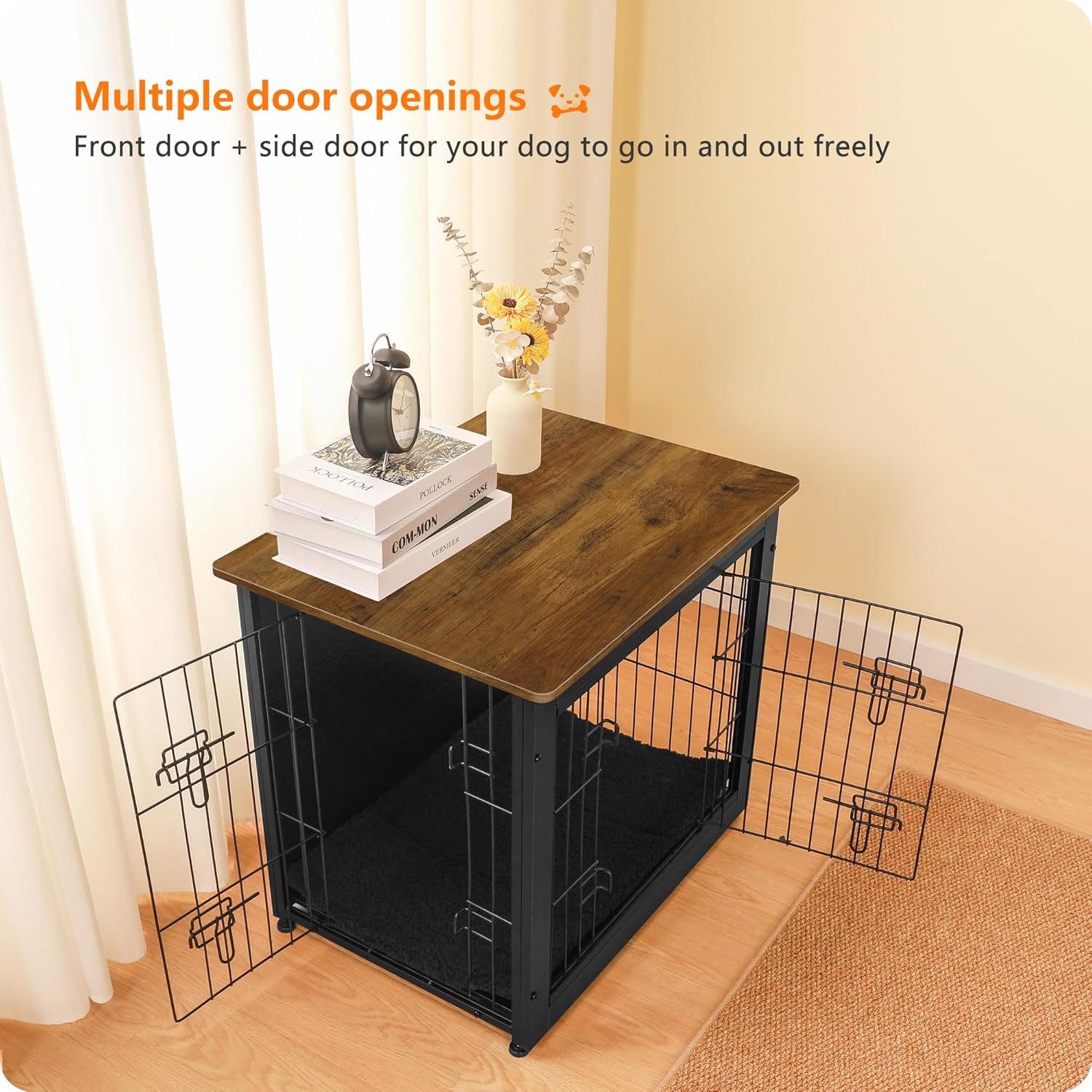 DWANTON Dog Crate Furniture with Cushion, Wooden Kennel Table with Double Doors, Indoor Dog House, Small/Medium/Large Size, 27.2" L, Black+Warm Brown