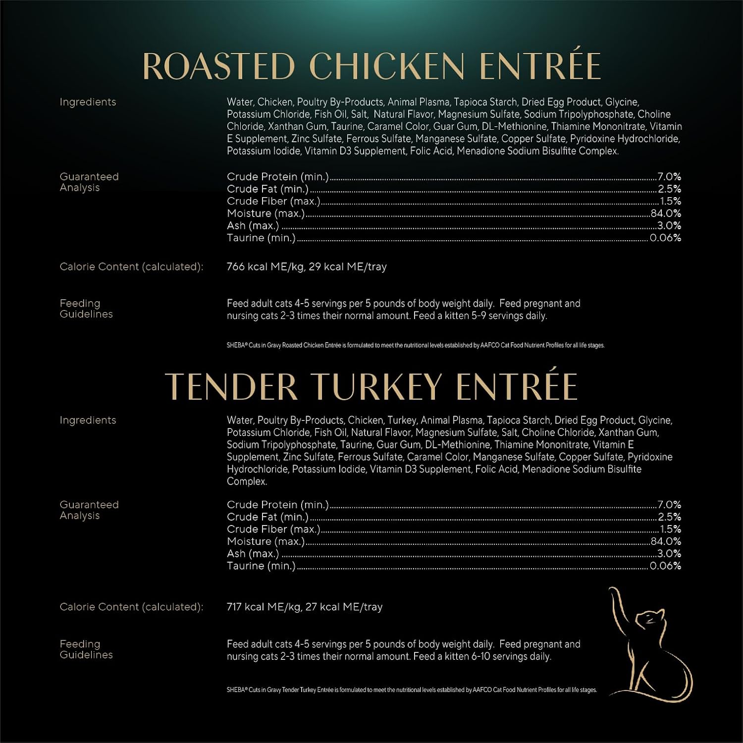 Sheba Perfect Portions Wet Cat Food Cuts in Gravy Variety Pack, Roasted Chicken, Tender Turkey, with Sustainable Salmon, and with Sustainable Tuna, 2.6 oz. Twin-Pack Trays (48 Count, 96 Servings)