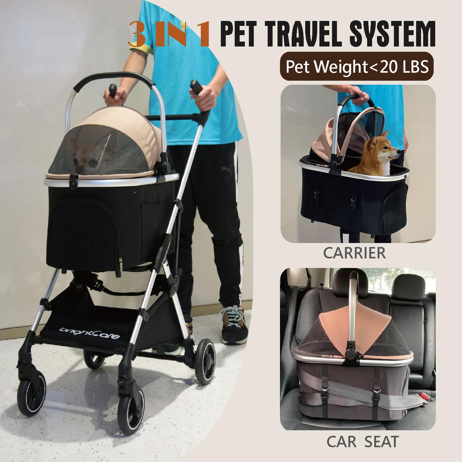 • 3-in-1 Versatile Design – Functions as a pet stroller, removable carrier, and converts to a car seat, perfect for daily use and travel.