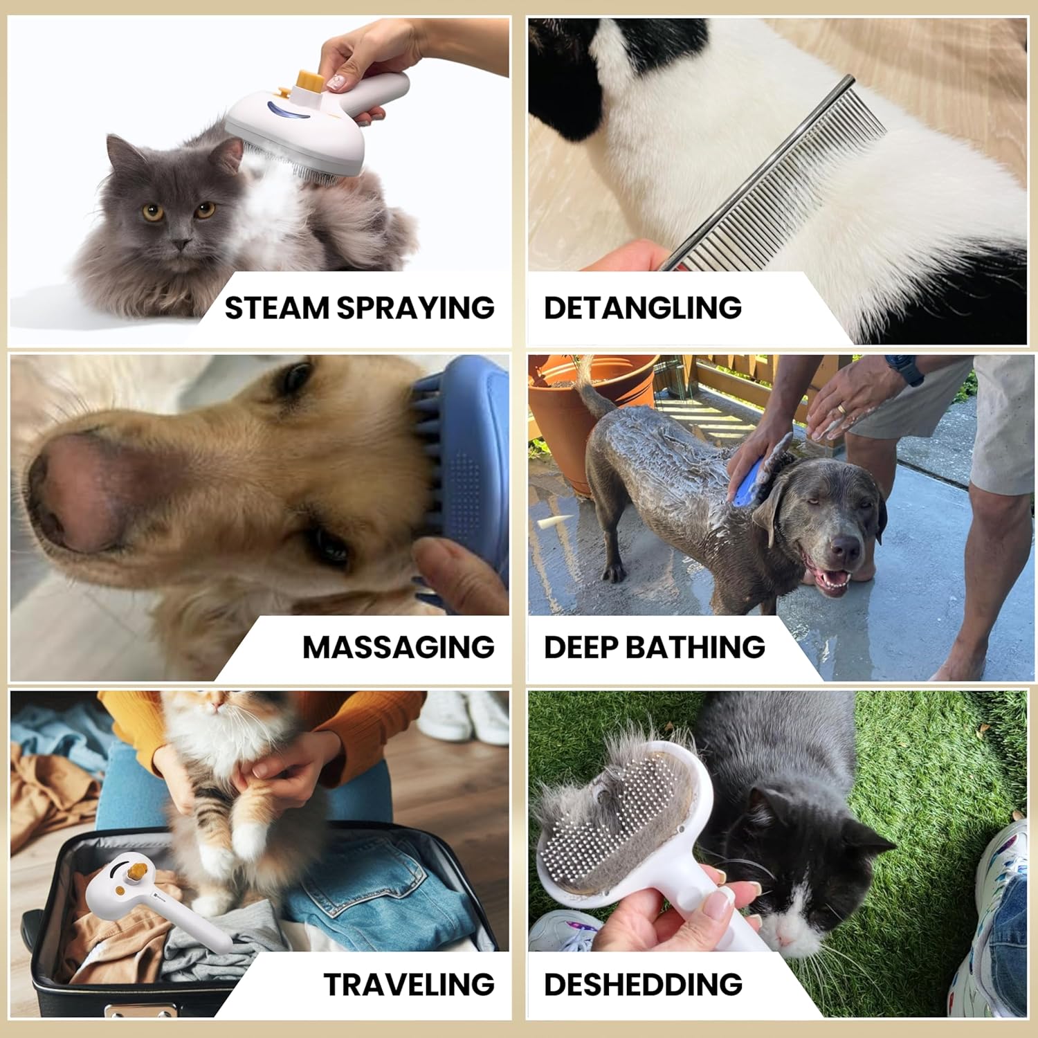 • [4-in-1 Dog/Cat Steamy Brush]: Our pet steam brush combines grooming, self-cleaning hair removal, steam spray, and anti-static features to help you easily address a variety of concerns. The steamy slicker brush for cats and dogs effectively removes tangled and loose hair, helping to prevent flyaway hair. (Note: Our pet steamy brush only converts water into spray and does not heat it.)