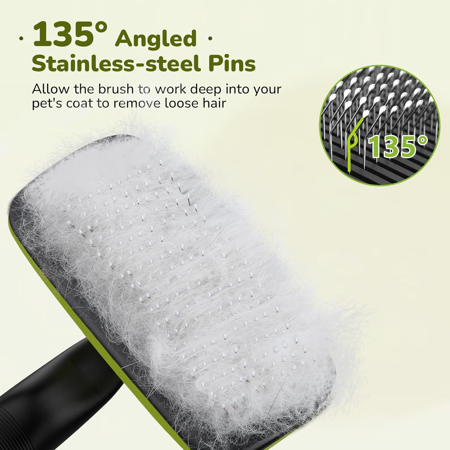 • EFFICIENT FUR REMOVAL, GENTLE ON YOUR PET'S SKIN : The pet hair brush is designed with fine 135ยฐ stainless steel bristles and gentle massage particles that effectively remove loose hair, dander, & dirt trapped beneath the fur without causing any discomfort or irritation to the pet's skin. Leave the pet's fur soft and shiny!