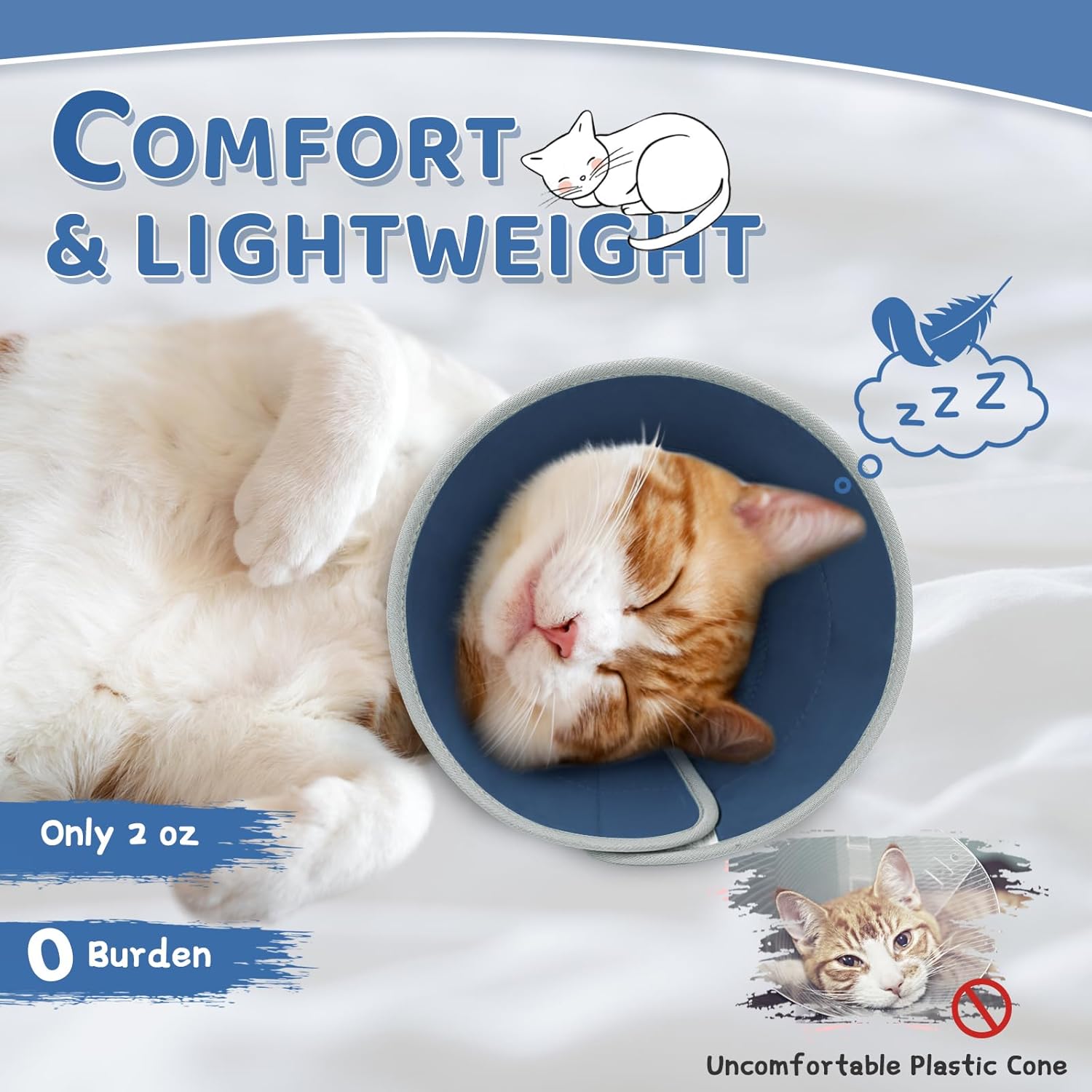 - ใComfortable Kitten Coneใ: This soft cone for cats is made of high-quality EVA material and PU fabric, comfortable and durable, lightweight and soft. It has improved the heavy, stuffy, and uncomfortable problems of the hard plastic Elizabethan collar. Your lovely cat will feel extra comfortable wearing it. And the foldable design allows your cute pet to eat normally, sleep relaxed, and enjoy playing as if it's not wearing anything