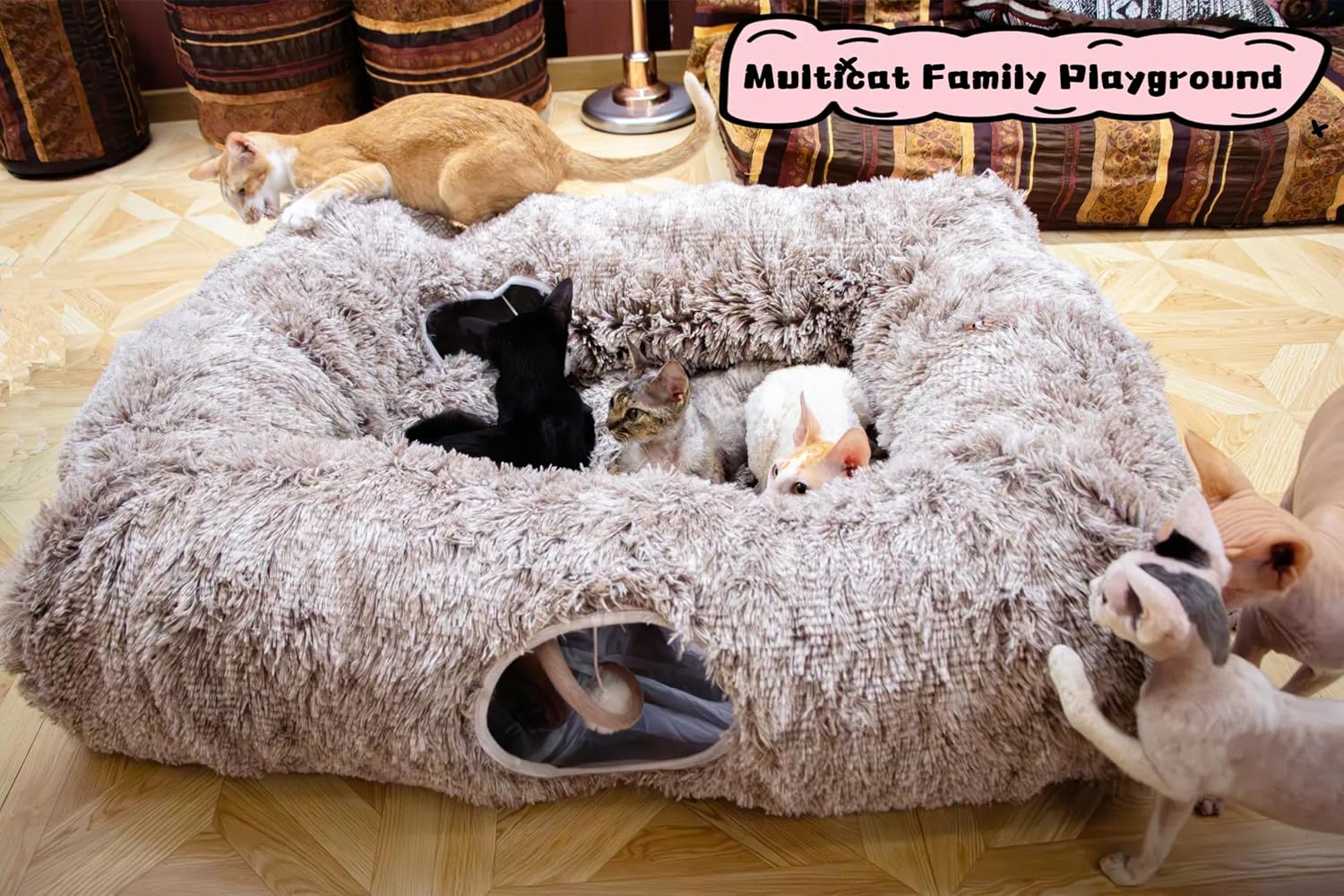 • Interactive and Fun: With four tunnel openings and dangling balls, this bed encourages active play and human-pet interaction, elderly or disabled cats cat can easily conduit the center mat without jumping over the tunnel, providing untold entertainment for cats.