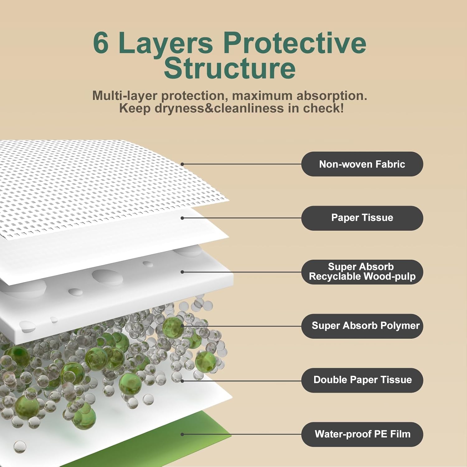 • 【Leakage Protection】Our disposable pet training pads feature a 6-layer absorbent design, enhanced with high-polymer materials that quickly absorb urine, preventing odor spread. The PE bottom film provides exceptional leak-proofing, ensuring that urine doesn't seep through to floors or carpets, which will preserve the cleanliness of your home environment.