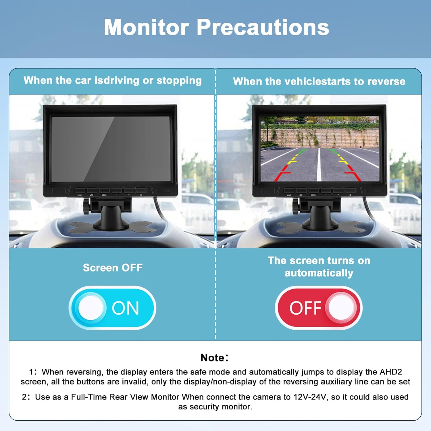 • Wide Viewing Angle and Automatic Parking Display: This bakcup camera for truck has a 110ยฐ horizontal and 130ยฐ diagonal viewing angle with no blind spots. At the same time, when reversing, the display enters the safety mode and automatically jumps to the AHD2 screen to ensure driving safety