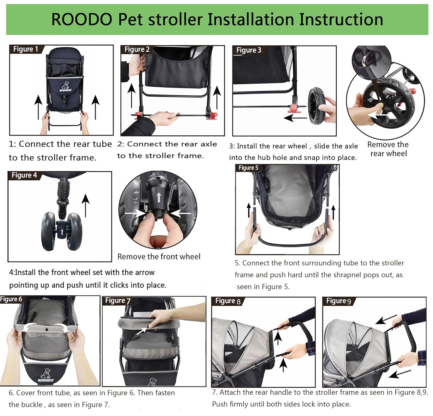 • ROODO multifunctional 4 wheel pet stroller is smooth and easy to use. The pet rest area is covered with multi-directional breathable nets to enjoy the fresh air and protect your pets from insects. Equipped with a storage basket for easy storage of items. The pet stroller can be folded easily and compactly enough to fit into the trunk of the car. It is a great choice to bring your pet, walk, jog, travel and enjoy the outdoors together.