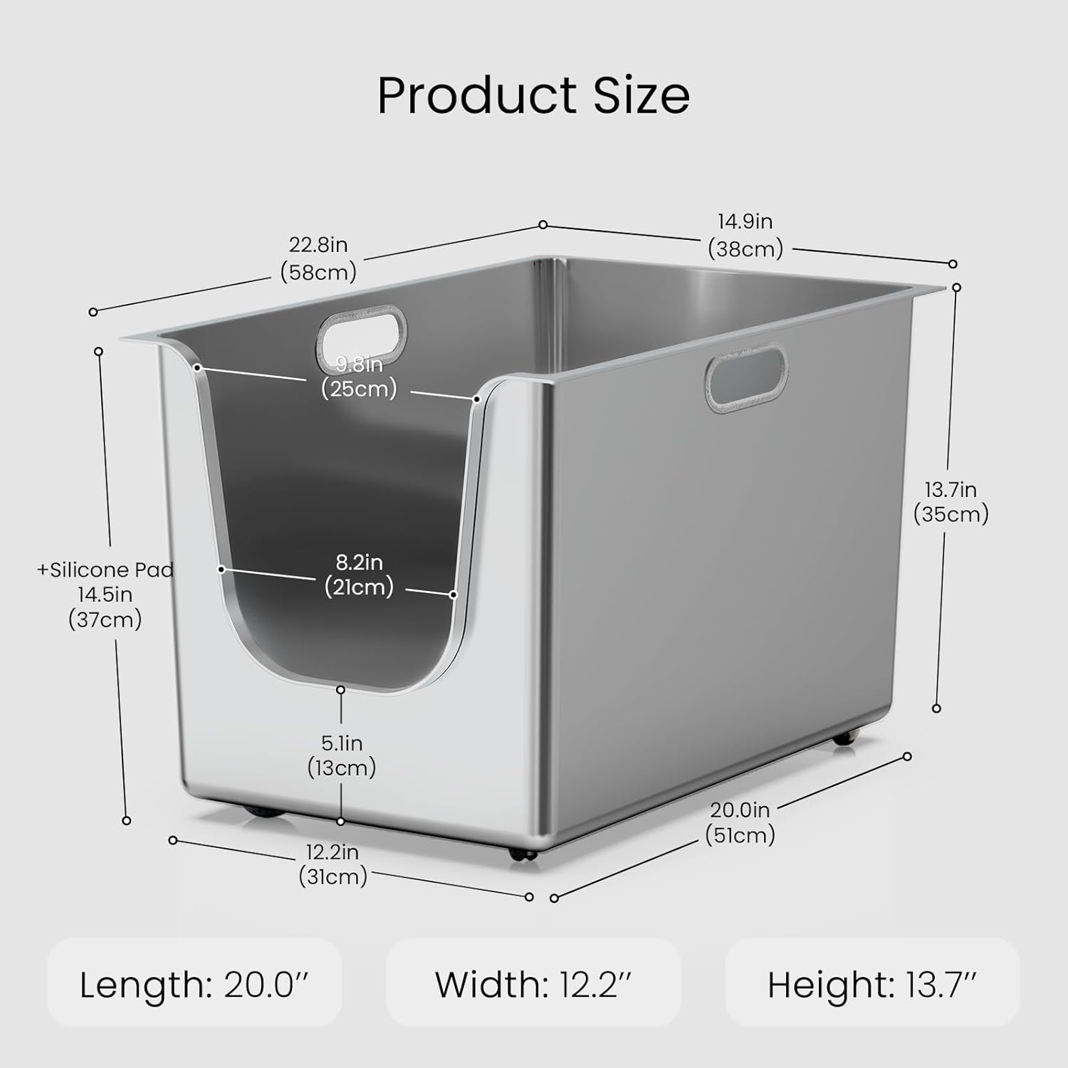 - All Metal Litter Box: Crafted from full stainless steel, rust-resistant, odor-free and non-stick, this high sided litter box boasts 13.7" high sides deep litter box design that prevents cats from kicking litter out of the cat box. One-Piece Stainless Steel cat litter box large for big cats effectively keeps cat urine from leaking and is friendly for high peeing cat