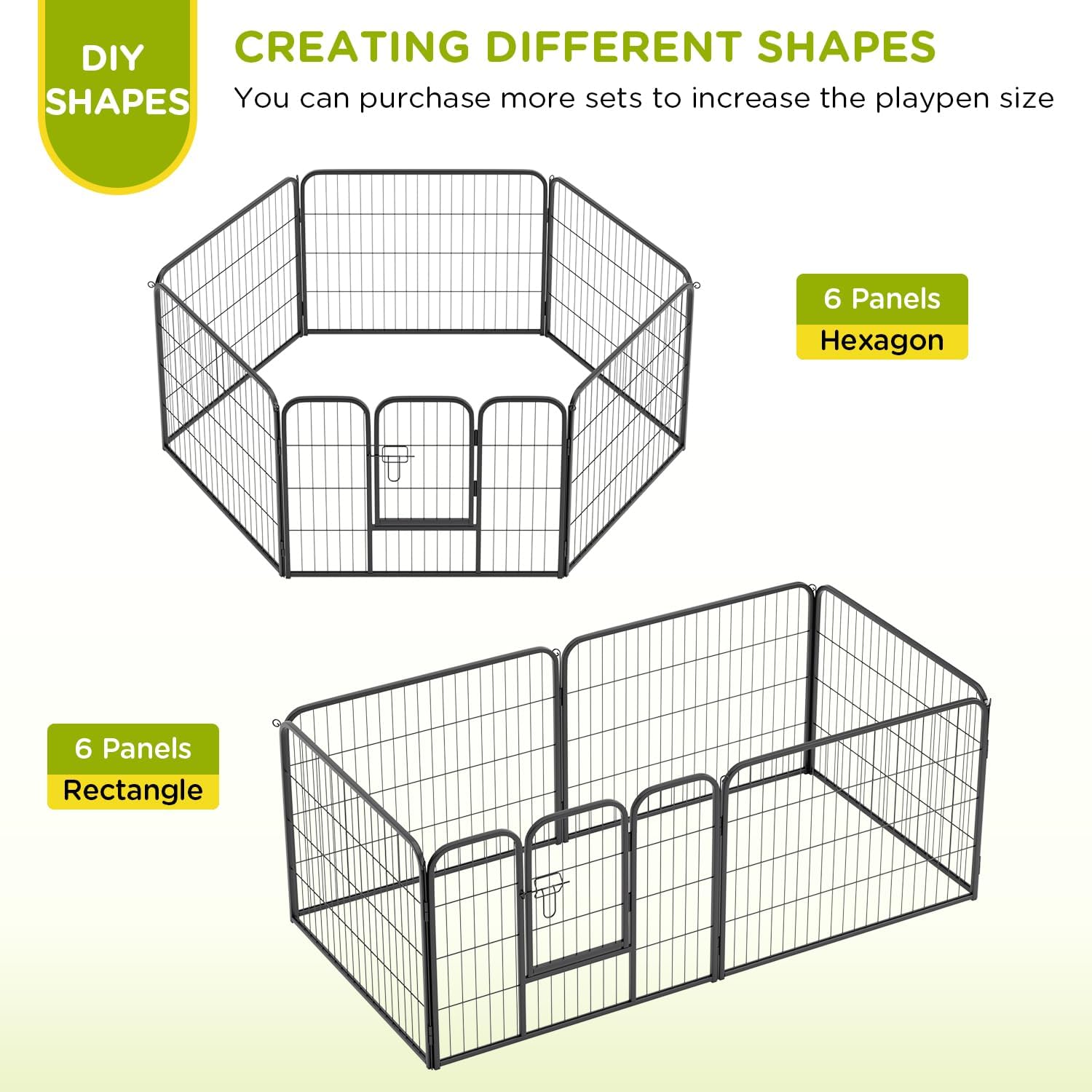 • EASY SETUP & CUSTOM CONFIGURATION: No tools are required. Shape this play pen into a square, rectangle, or octagon. Expand with panels to build a dog fence, large playpen, or dog run area.
