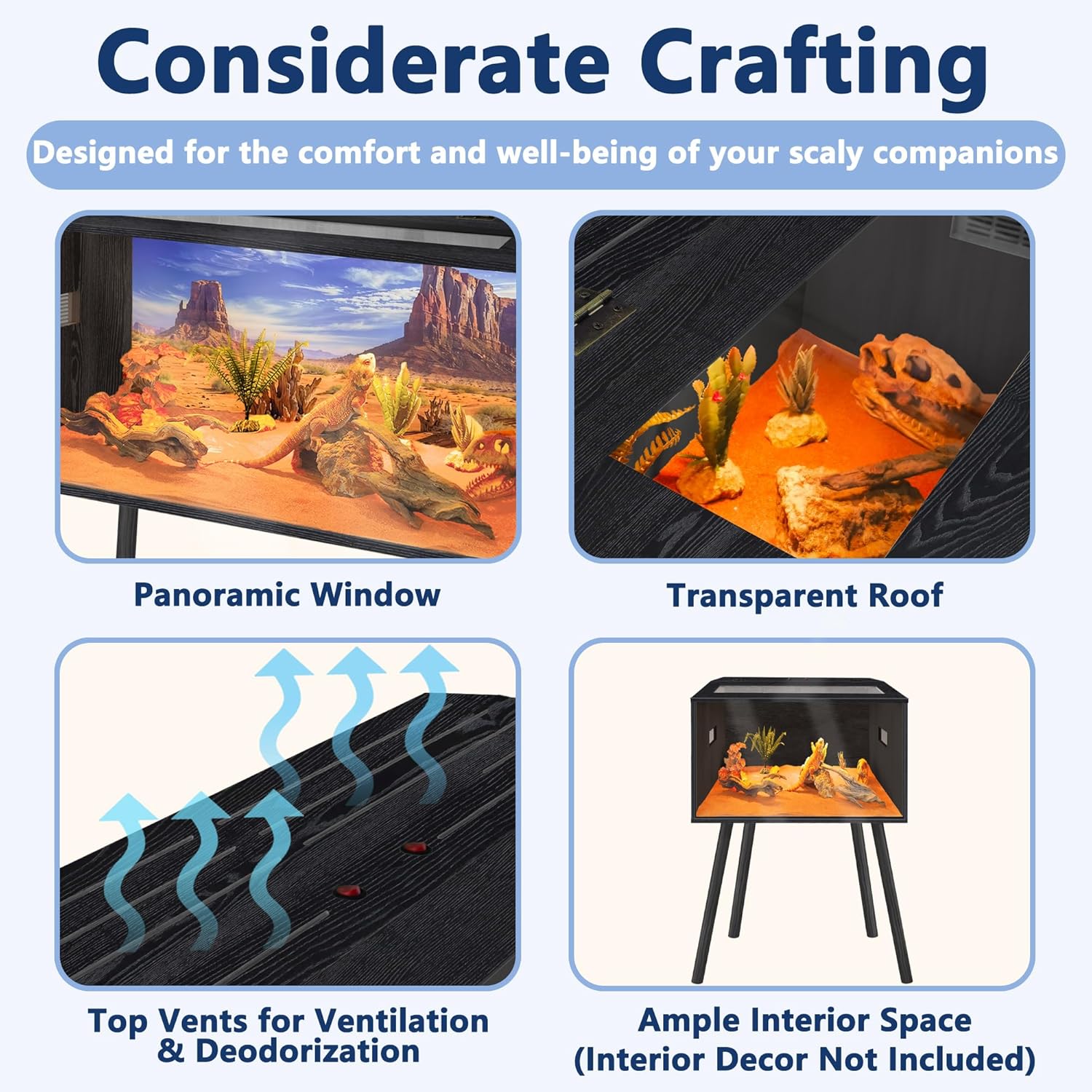 - 【Superior Craftsmanship】Built with high-density, pet-safe solid wood core and durable acrylic, this habitat offers long-lasting performance and a sophisticated look. The wood is coated for waterproofing and corrosion resistance. A waterproof acrylic bottom panel provides extra protection against spills or accidents. Available in four sizes (24–48 inches in length and 40 or 47.5 inches in overall height), this enclosure is designed to fit a variety of reptile needs. Refer to the image 2 for detailed dimensions.