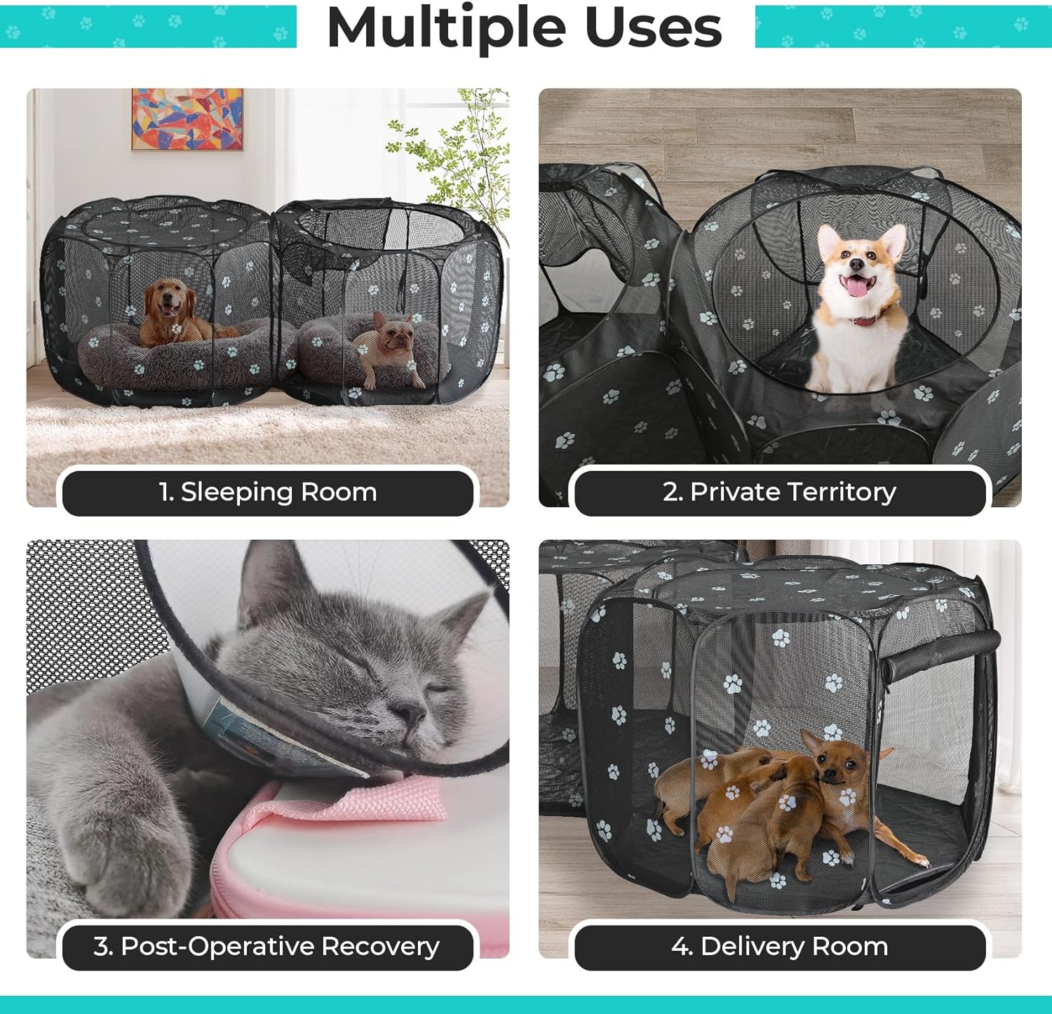 - ใ2 in 1 Design with cute paw patternใThis cat playpen is upgrade version with cute paw pattern print. Design with 2 compartments, best for multi-pet households, or new pets to make friends. Double rooms pet playpen is also helpful for their potty training with a cat litter box in the compartment.