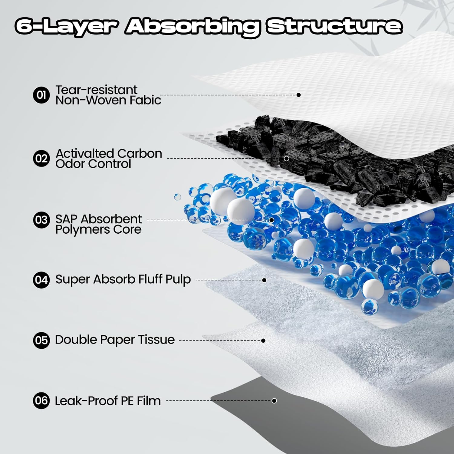 • 🦴【Super Absorbent & Quick Drying】6 layers of protection designed with polymers for super absorbency,converting liquid to gel in seconds for easy cleanup and staying dry.The non-woven fabric of the diaper pads accelerates liquid absorption and prevents reverse osmosis,keeping the surface dry quickly