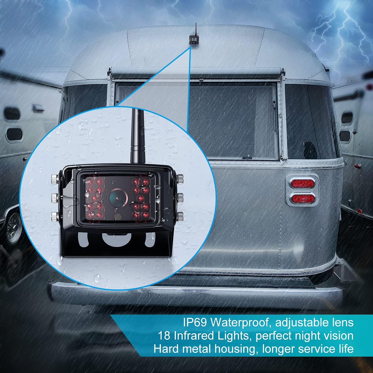 - ใWaterproof Cameras with Night VisionใThe IP69 waterproof camera works perfectly in any extreme weather. With 18 infrared lights, the camera will give you a high definition view of the night. The camera lens can be adjusted up and down, allowing you to view from different angles. The hard metal case allows the camera to be used for a longer period of time. (It can work with Furrion pre-wired RV, please ask us for the bracket adapter.)