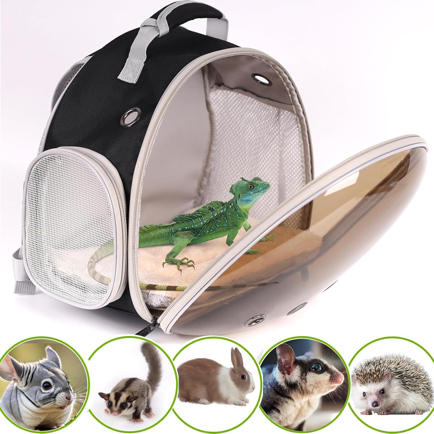 • 2024Upgraded Bearded Dragon Carrier with a big polarized bubble Window to protect your pet's eyes from strong light burns,The front hard clear bubble window is better to protect reptile from crushing and attacking if accidents, it also provides a nice front view so they could check surroundings without anxiety.