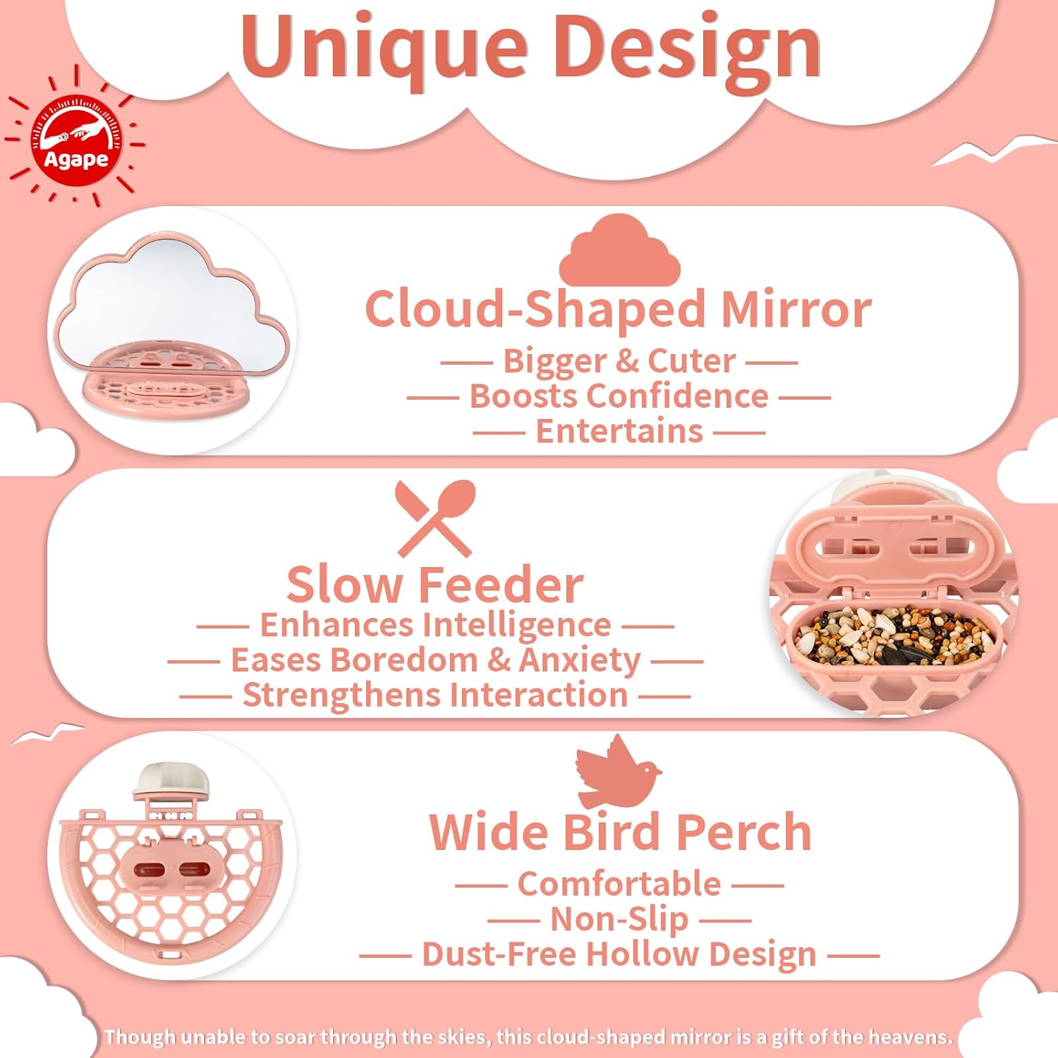 • 【Concept】Inspired by the soft, flowing shapes of clouds in the sky, our product symbolizes the freedom we wish for birds to have. While our birds may not soar high above, we can still gift them a special treasure from the heavens. If you have any questions or need assistance, Agape is here for you 24/7, ready to provide support whenever you need it