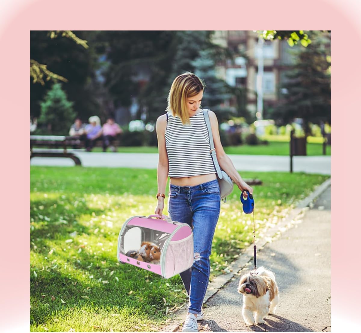 • 【Transparent Portable Design】1 transparent clear windows in front of the guinea pig carrier bring your pet closer to the surrounding environment,Allow you to communicate and interact with your pet ,3 vent holes in front and 1 side opening mesh door are designed to ensure fresh air and air circulation for your furry child and they can enjoy the scenery. There is a side pocket which is very convenient for you to foldable bowls, toys and store food.