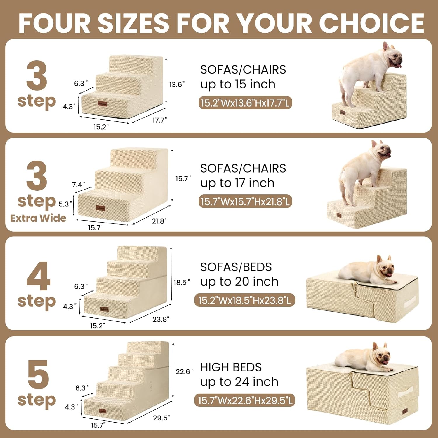 • DIMENSIONS AND SIZE OPTIONS; 3 step dog stairs with height 13.6 inches for couches up to 15 inches; 4 step dog stairs with height 18.5 inches for sofas and beds up to 20 inches; 5 step dog stairs with height 22.6 inches for higher beds up to 24 inches
