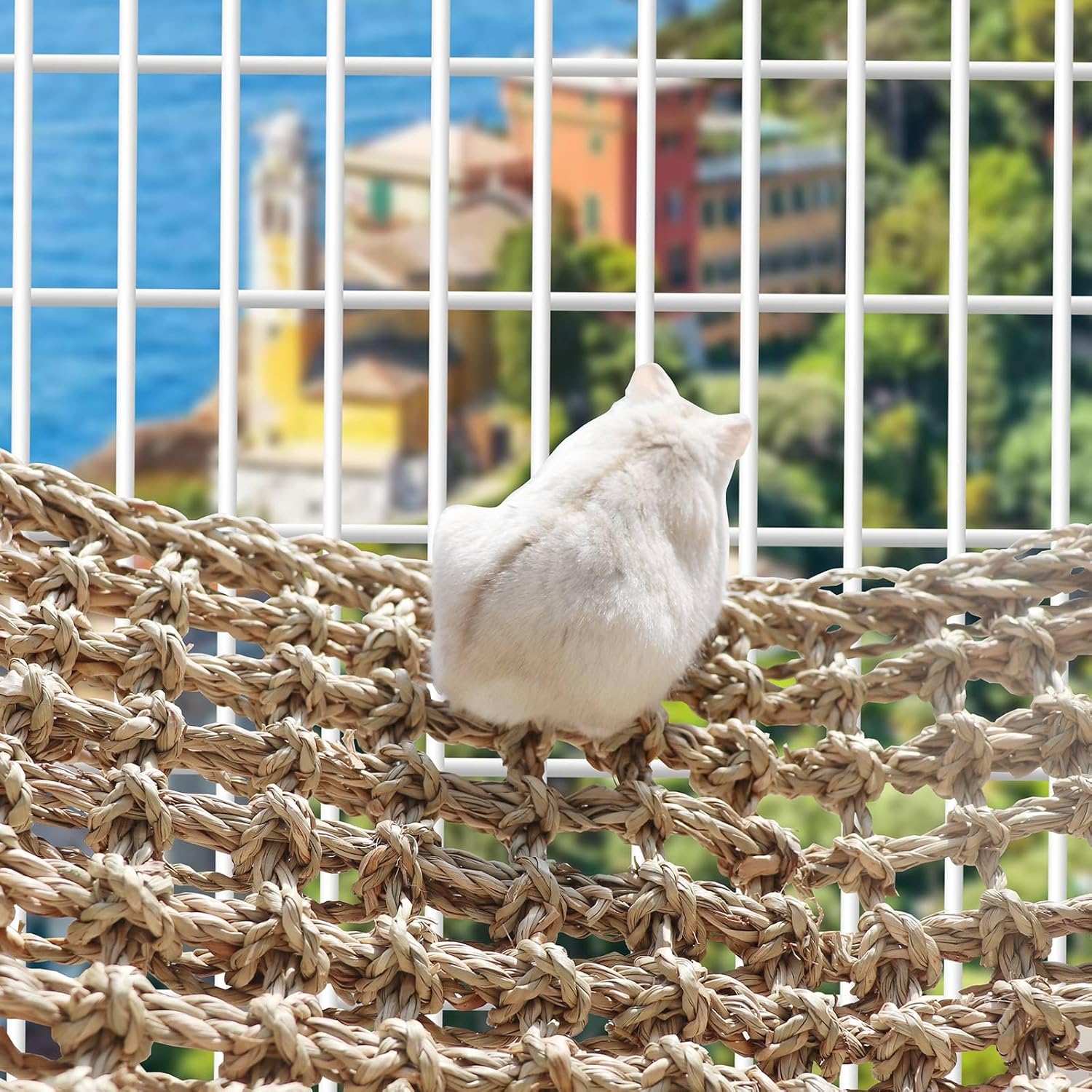 • Multiple Installation Methods: The package of the seagrass mat contains 4 very strong plastic hooks. You can hang the seagrass mat in parallel to make a hammock swing toy, or hang the seagrass mat vertically to make a bird ladder climbing toy.