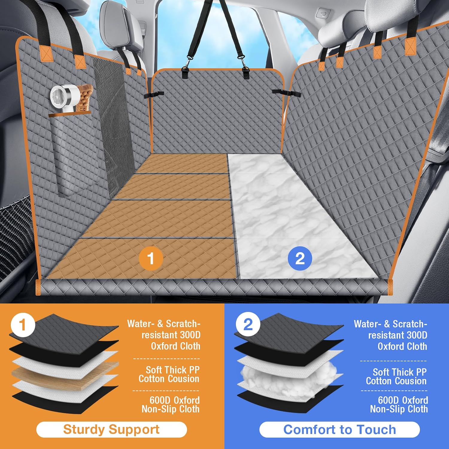 • 【No More Pets Falling】The back seat cover for dog features sturdy bottom board, which is strong enough to support your dog with dog safety seat belt to prevent your pet from sliding during drive.