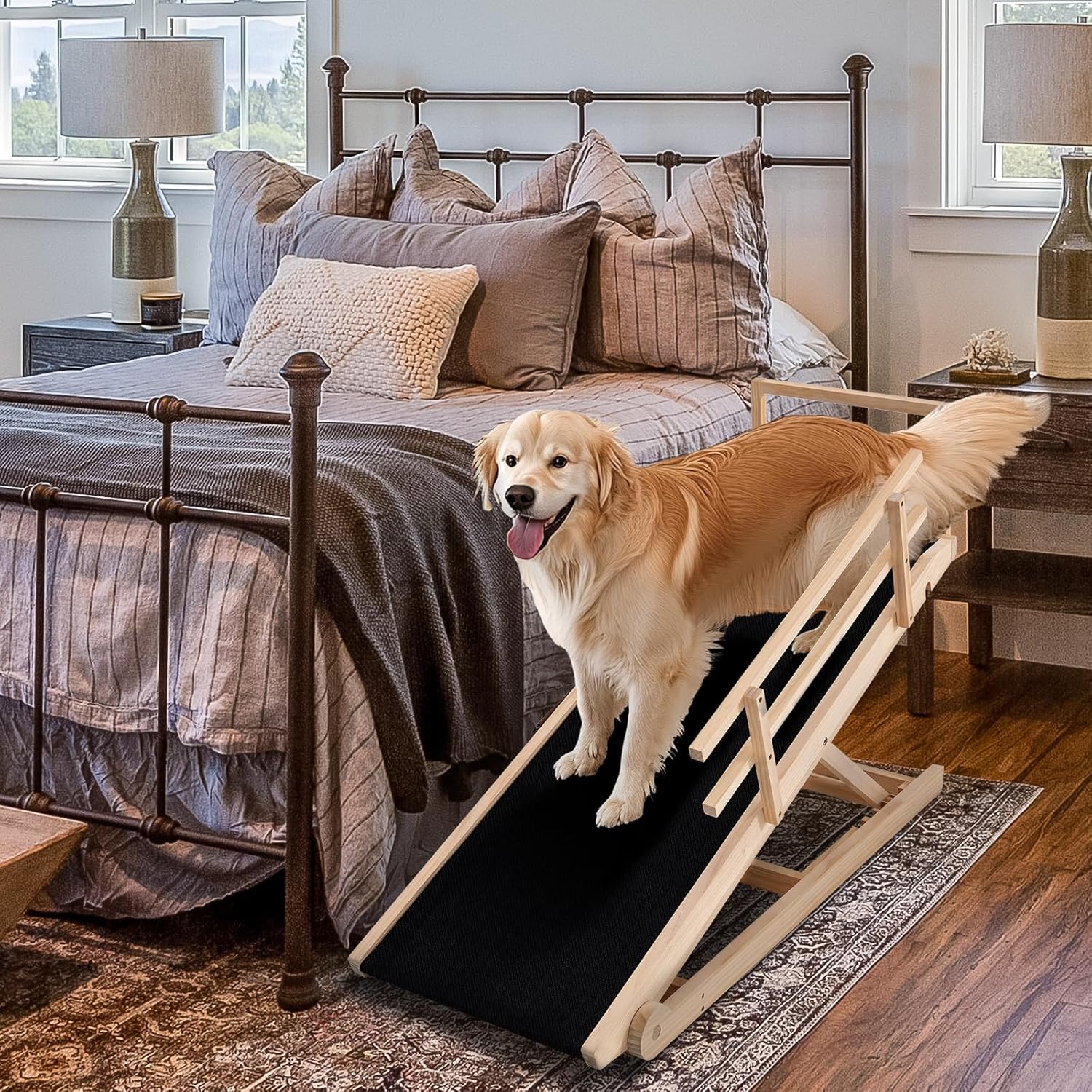 Dog Ramp, 5 Level Adjustable Wooden Folding Pet Ramp for Middle Bed, Couch,SUV-High Traction, Portable Paw Ramps for Small & Large Old Dogs & Cats - Furniture Quality