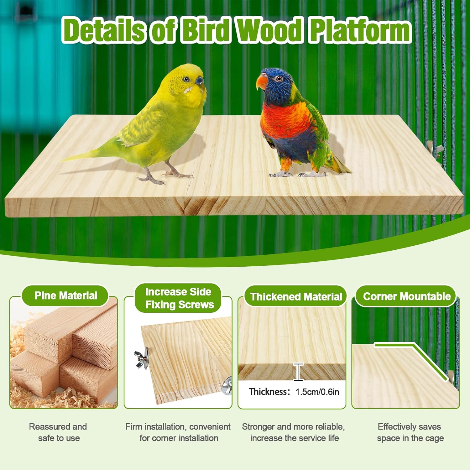 • EASY TO INSTALL: Large Parakeet wood cage platforms includes 2 wing nuts, 6 spacers and 2 wooden boards, you just need to adjust parrot stand platform to the proper position of the birdcage and then tighten the nuts