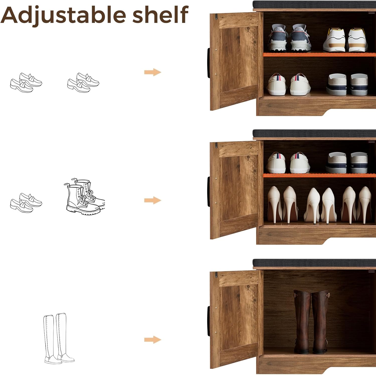 • Keep Your Shoes Organized: The depth of bench is 13.8 inches, which makes it easily to put in your shoes, meanwhile shoes of various heights can be placed by adjusting middle movable boards. The bench doors design ensures not only your privacy, but also a tidy space