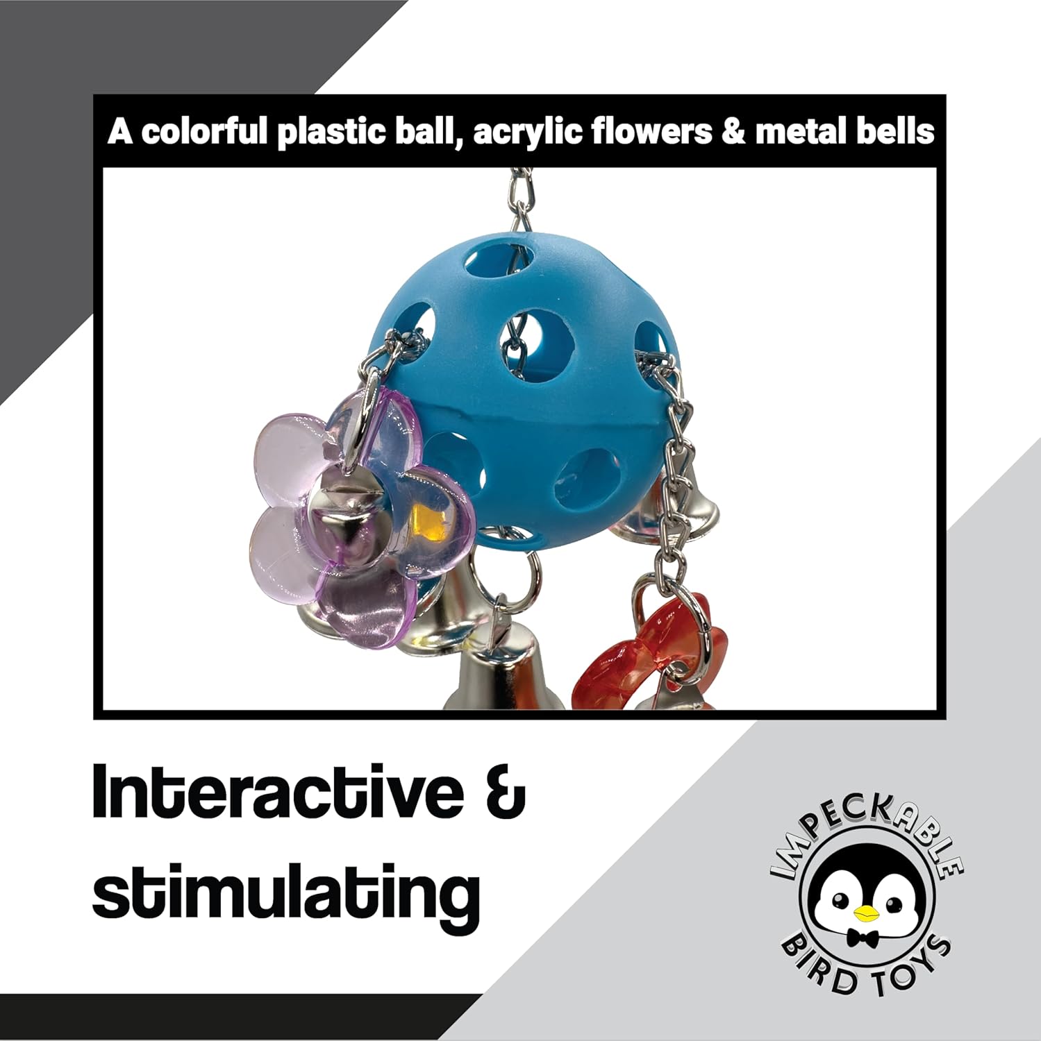 • - 1937 Flower Ringer Bird Toy features colorful acrylic flowers, bells and chain legs for a bright and engaging cage play experience