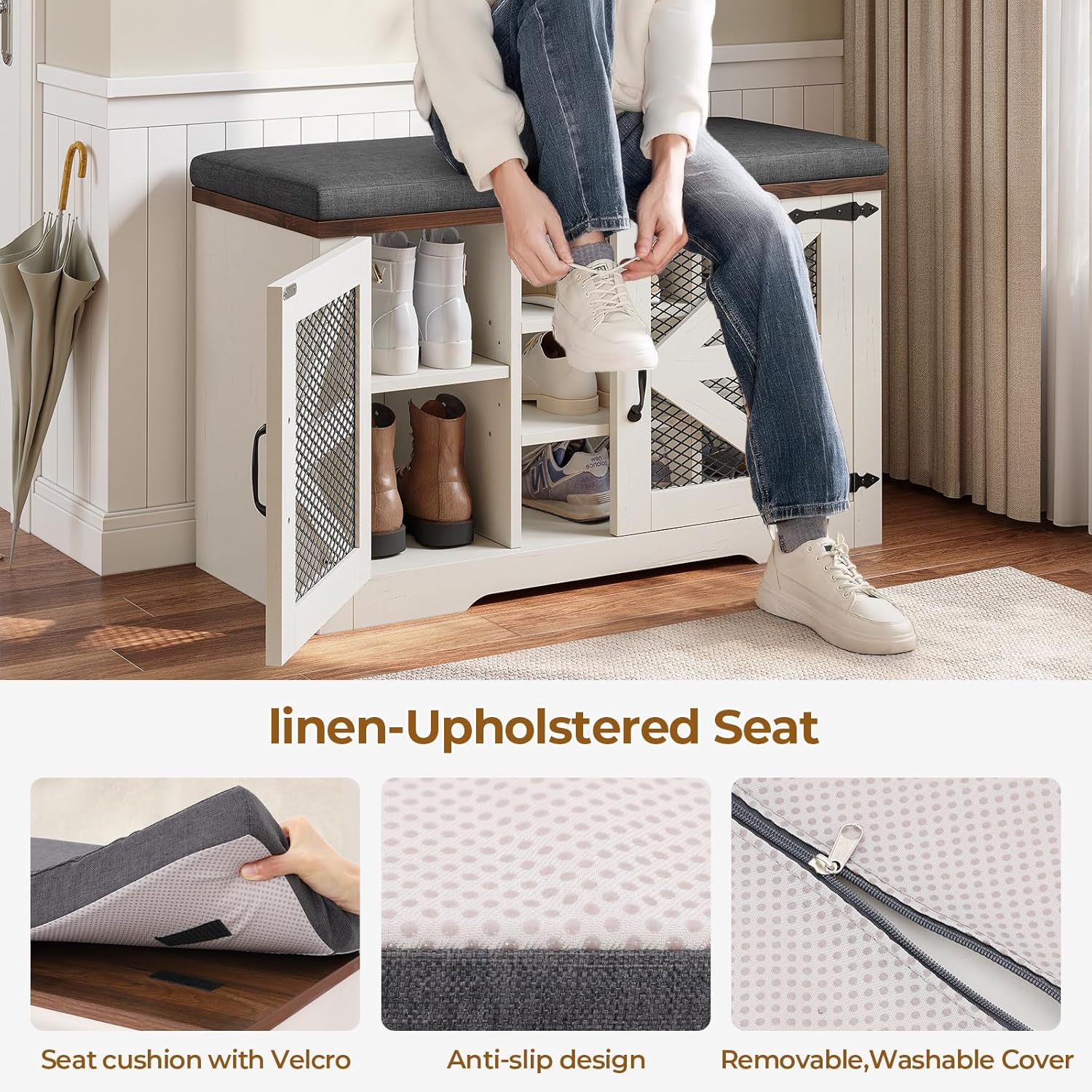 • COMFORTABLE AND CONVENIENT: This entry bench seat not only offers shoe storage but also comes with a soft cushion and an extra-long bench. It provides a comfortable seating area while putting on or taking off shoes. The soft and comfortable cushion adds to the overall convenience, keeping you in a good mood before heading out.