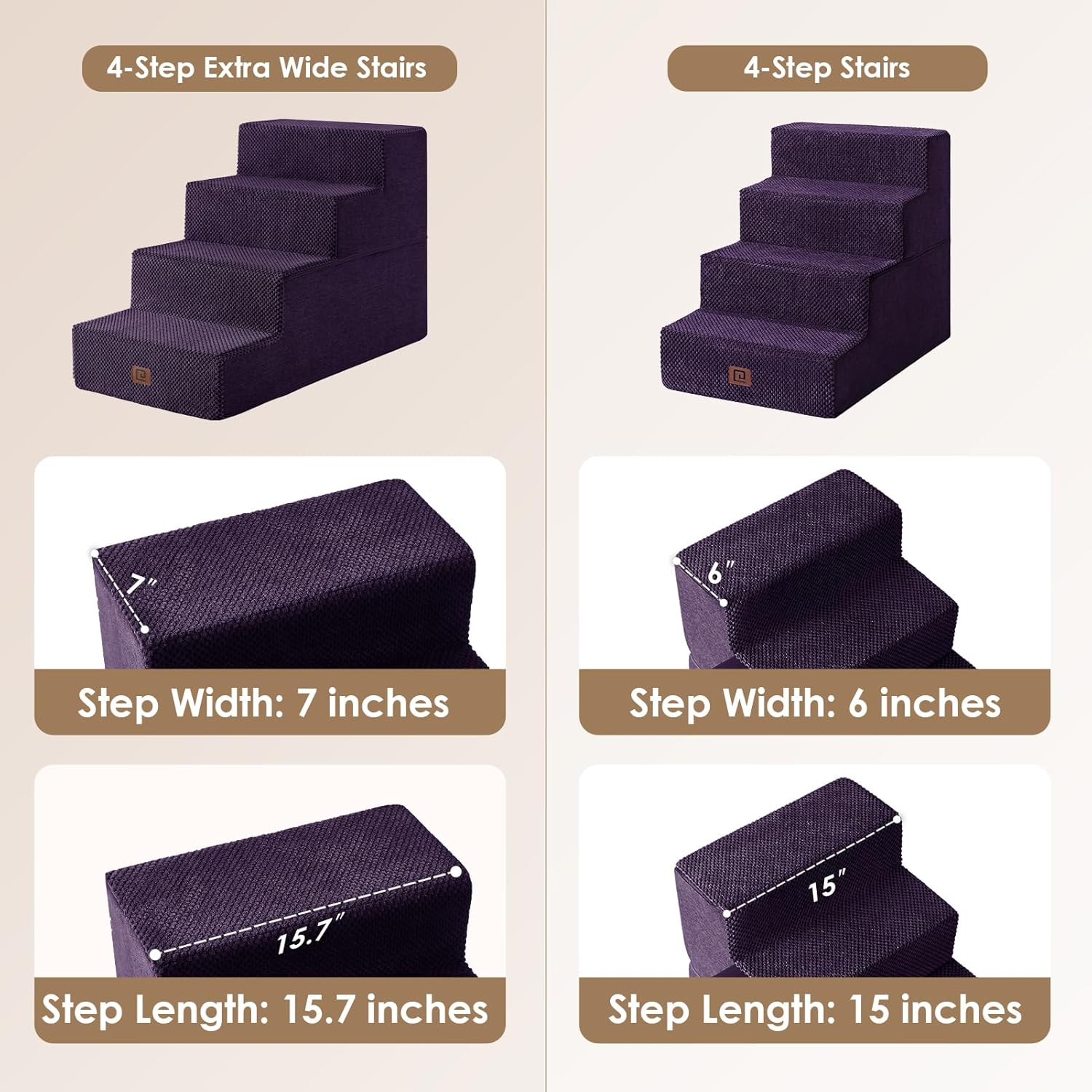 • MULTIPLE STEP SIZES - This dog stair comes in 3, 4, and 5-step options. Our 3-step pet stair is ideal for sofas and low beds (up to 18 inches high), while the 5-step version is better suited for higher beds (up to 27 inches). If your bed is of medium height (up to 23 inches), please select the 4-step one.
