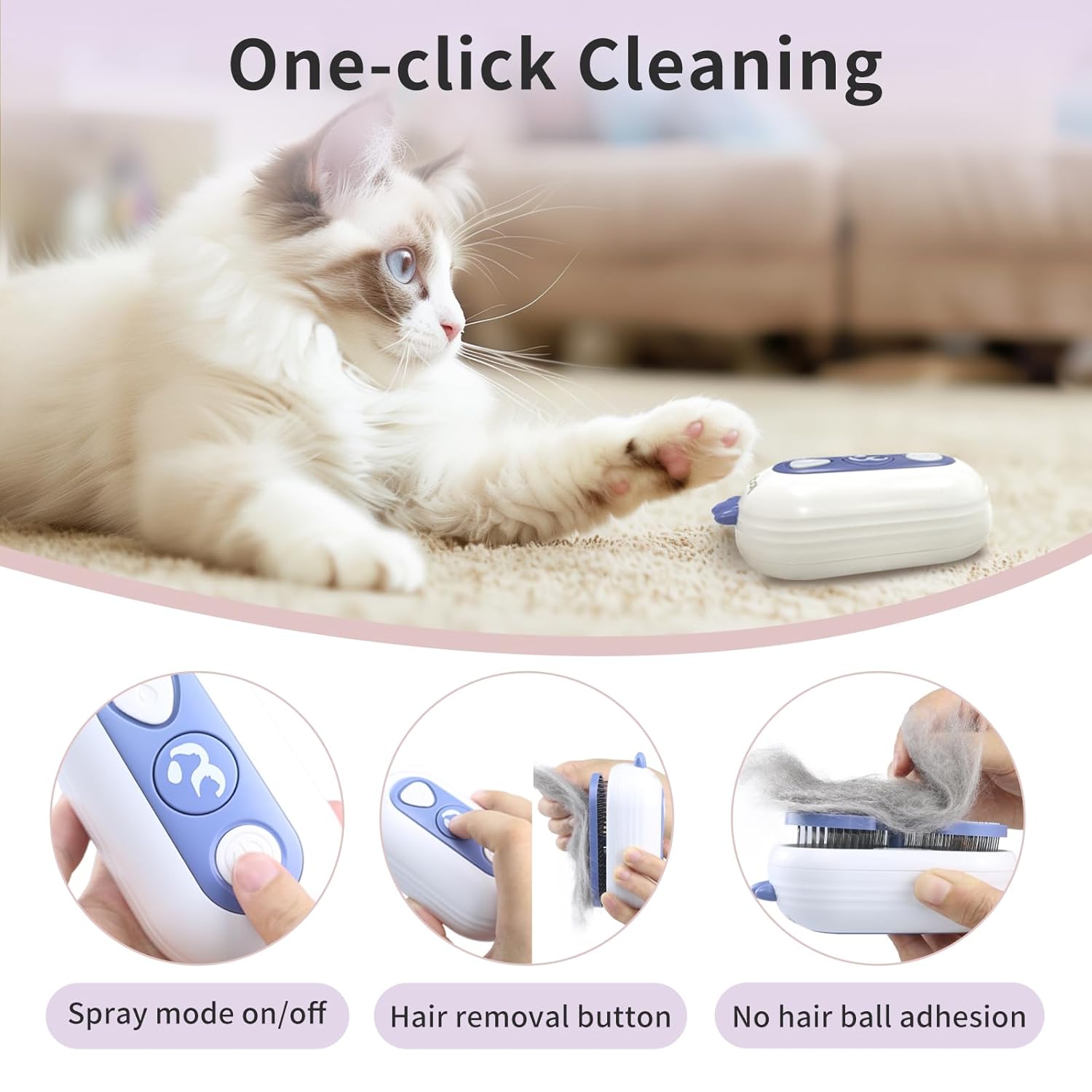 • 3-in-1 Care - The cat brush with steam combines hair removal, normal temperature mist spray, and one-button quick cleaning in one tool, simplifying the grooming process. The spray feature is especially helpful in preventing static electricity and keeping the fur soft and manageable. This pet steam brush is ideal for indoor use, allowing your pet to enjoy a self-grooming experience at home