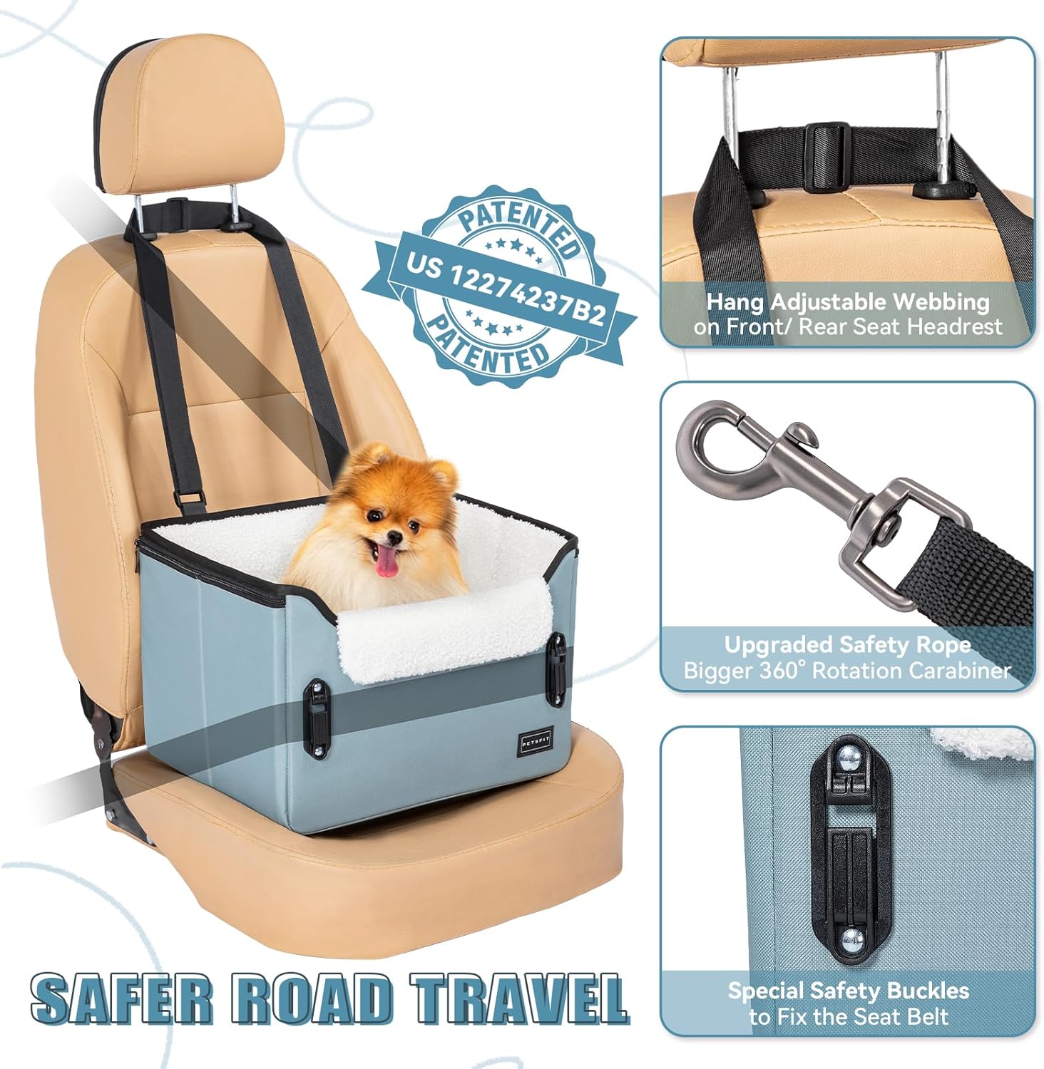 • [Patented Buckles Provide More Security] With your pet's safety as our top priority, the dog car seats for small dogs feature patented safety buckles (Patent Number: US 12274237B2) and an adjustable safety belt. These features secure the dog booster car seat in place, allowing your pet to stay comfortably secure and letting you enjoy stress-free journeys