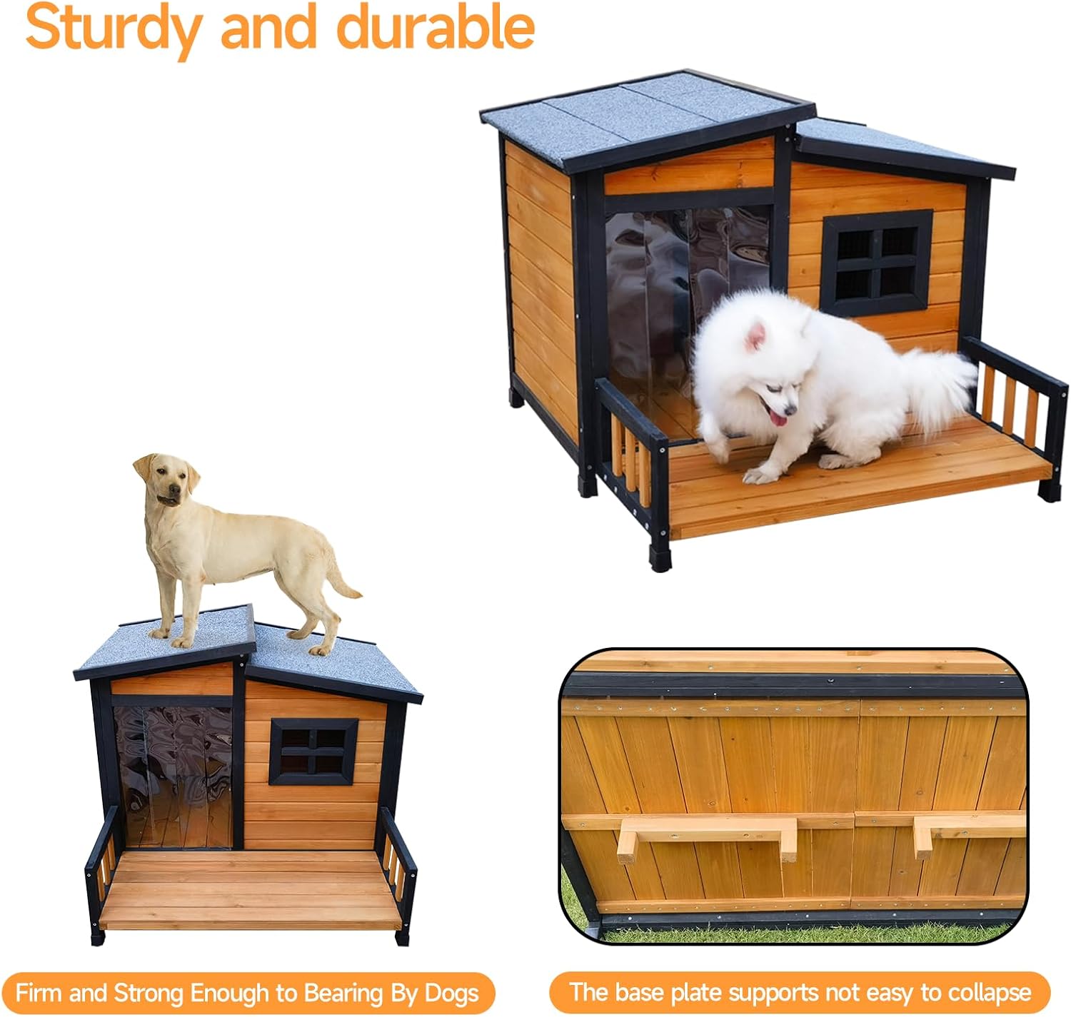 • Withstand Bad Weather:The outdoor dog house consists of a strong & sturdy pine construction. PVC curtain away from wind and rain. Heavy-duty mineral roofing felt and a weatherproof sealer provide ultimate protection for long-term outdoor use.Anticorrosive plastic feet can survive harsh outdoor conditions while preventing scratches on indoor floors.