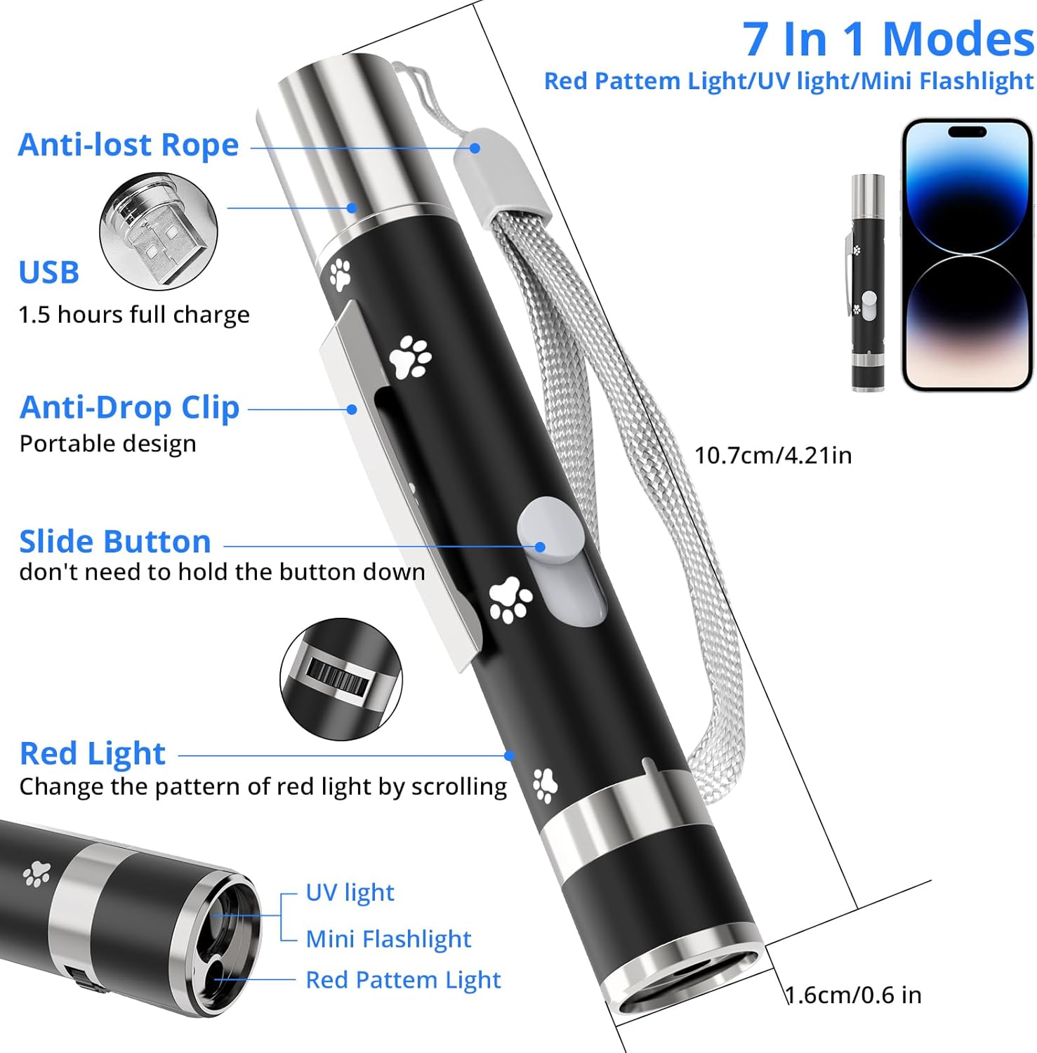 • 【Versatile Functionality】This cat wand toy is more than just a pet accessory. It doubles as a presentation pointer with a bright beam for clear visibility. Easily activate it with a single push—no need to hold the button continuously. It also features a glow-in-the-dark light mode and a purple mode for detecting counterfeit money.