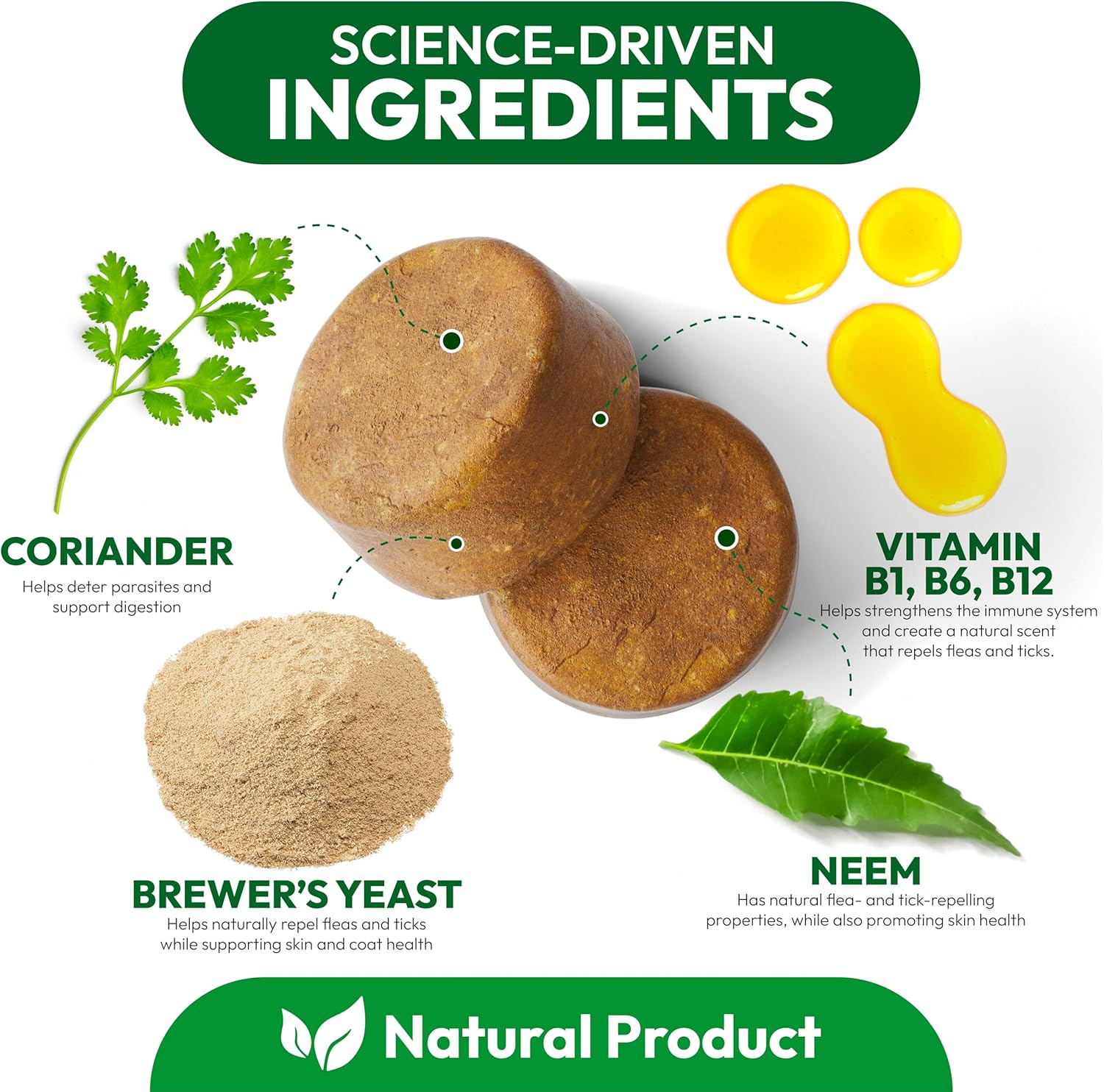 • Natural & Safe Ingredients: Manufactured with carefully selected natural ingredients, our flea and tick prevention for dogs chewable helps protect your dog's health without harsh chemicals.