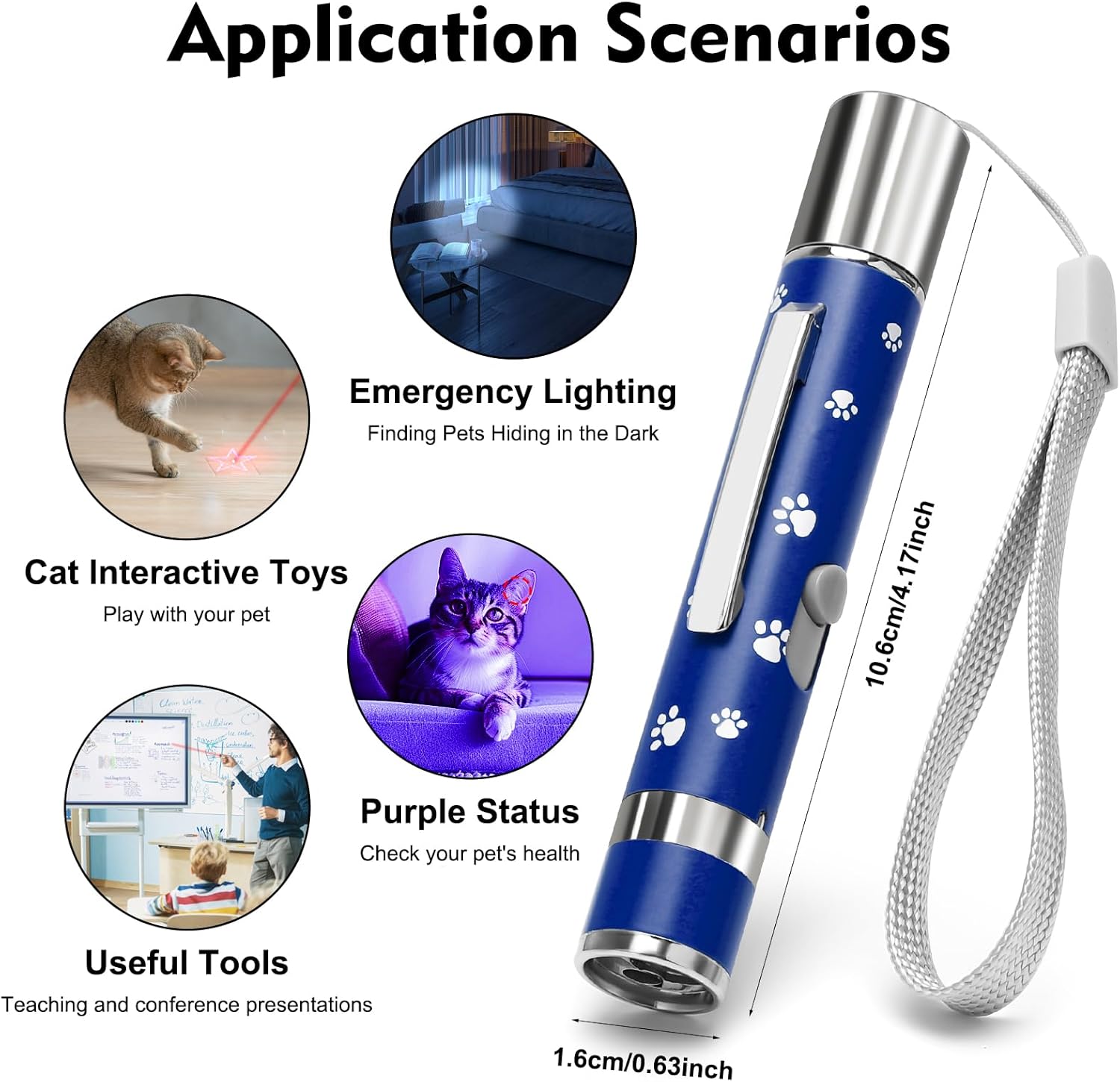 • Multi-scenario application: The red mode is great for interactive play with your pet, the purple mode can be used for detecting counterfeit bills and pet health checks, and the white mode is great for emergency lighting at night. Whether it's for home use, outdoor activities, classroom teaching, or while traveling, this cat toys are easy to use