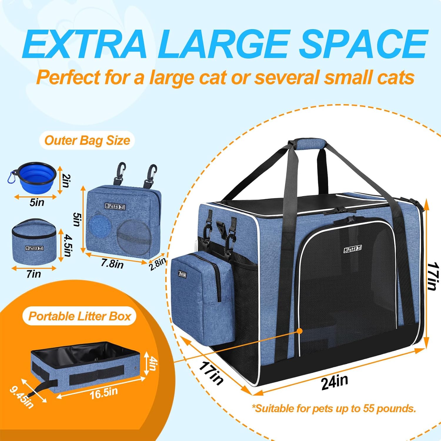 Petskd Extra Large Cat Carrier with Litter Box 24"x17"x17" for Medium Large Cat or 2 Small Cats, Collapsible Soft Sided Pet Carrier for Car Travel with Lockable Safety Zippers(Blue)
