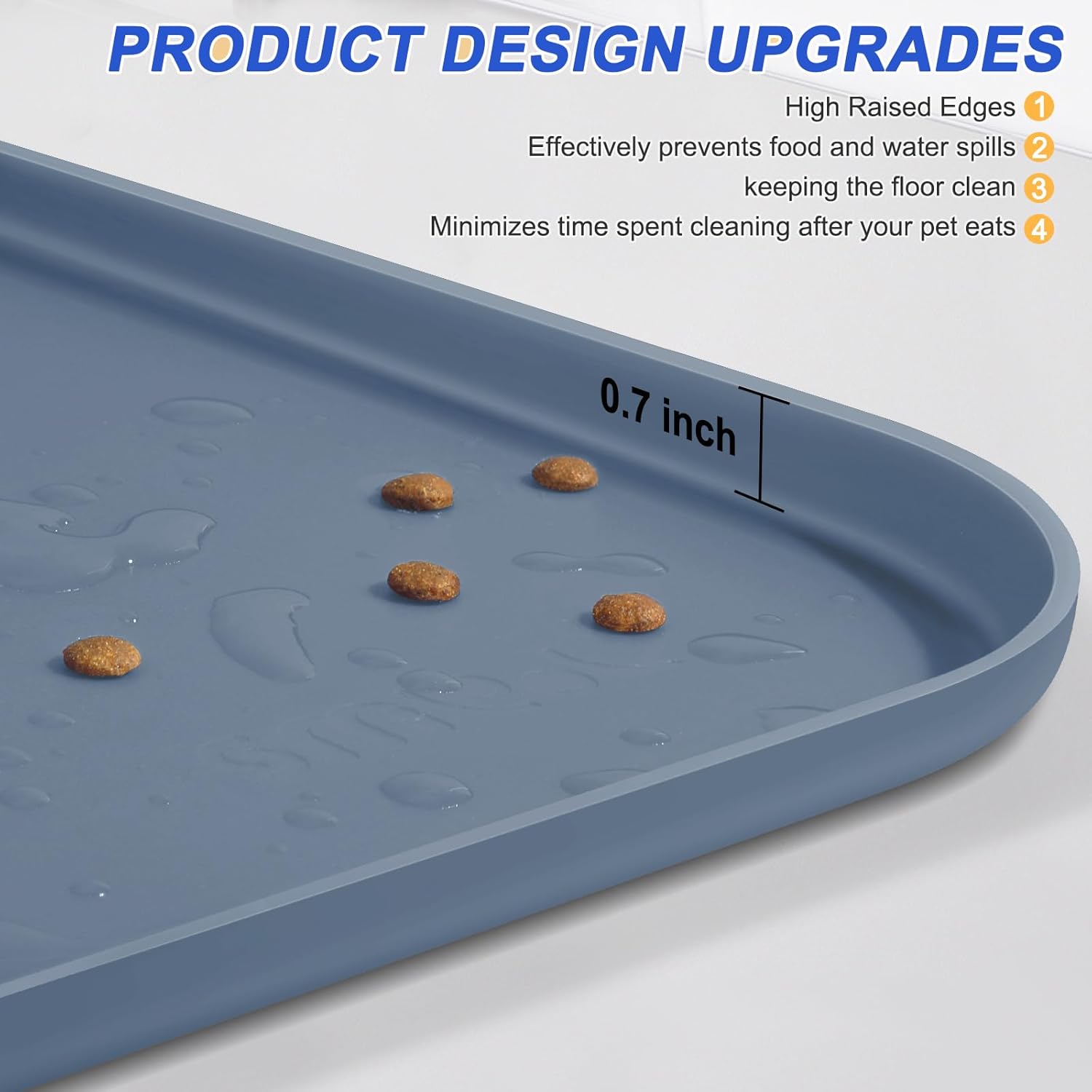 - Reinforced Raised Edges - The edges of the bpa free rimmed silicon dog dish trays for floor are 3 mm thick and have a 0.7 inch high raised lips, thicker and higher than similar products. This better contains food and water inside the mat, preventing messy spills during meals that can dirty your floors or lead to your pet eating contaminated food off the ground, risking their health. Not the same as absorbent pet feeding matts.