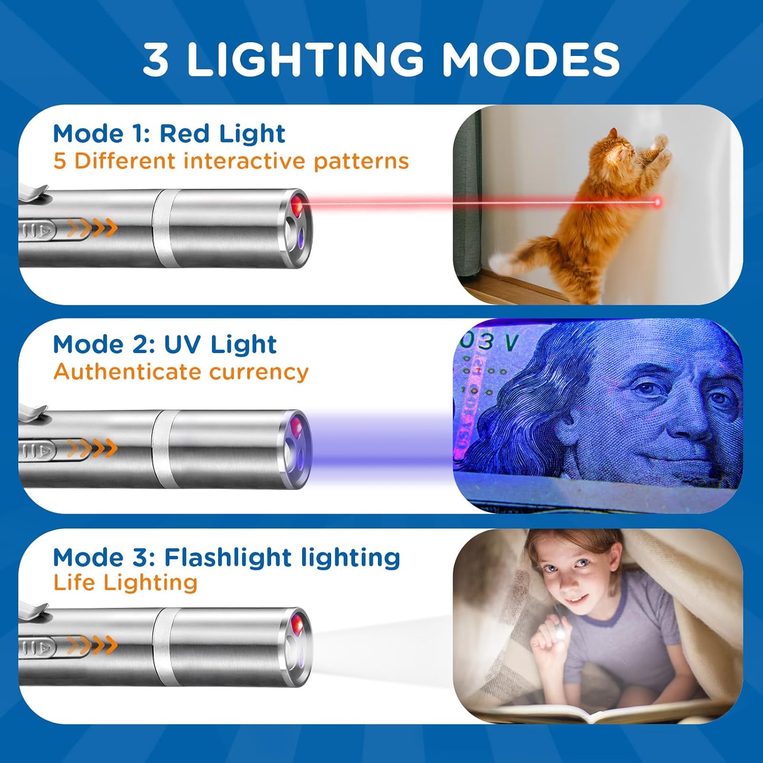 • Multiple Function: The cat light can also make you a presenter. It is bright that you can see clearly, making speeches or explanations easier and more convenient. Whatโ€™s more, you can turn on the switch with a single press instead of holding down on the button to keep lighting like most other cat flashlight do. Lighting mode can glow in the dark. Purple mode can detect counterfeit money.