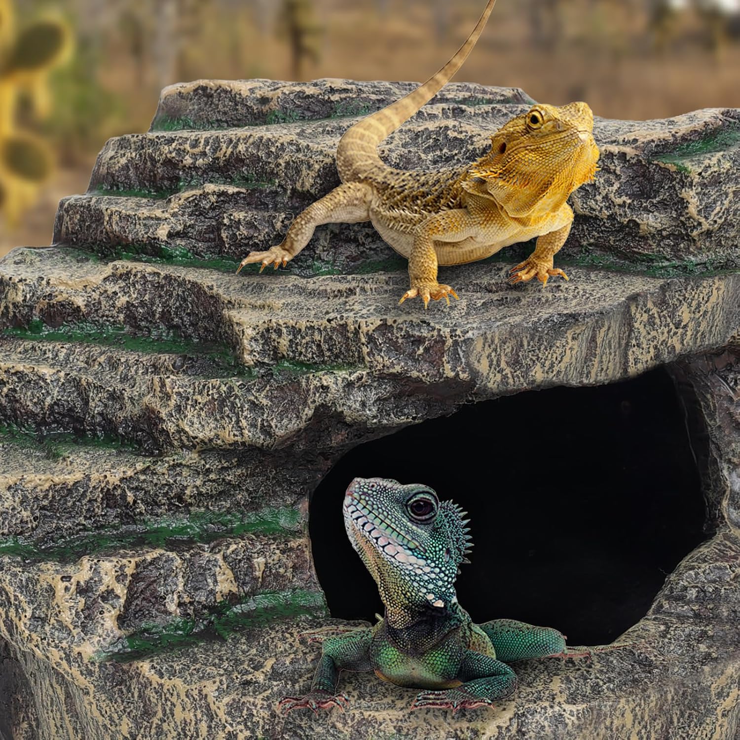 • MIMIC NATURE LOOKING: Our large reptile hide, such as the snake hide and lizard hides, also humid hide for leopard gecko, are designed to mimic natural habitats. Essential for crested gecko tank accessories and leopard gecko tank accessories ensuring a healthy and engaging environment. Perfect for snake enclosure accessories and ball python tank accessories,bearded dragon basking platform.