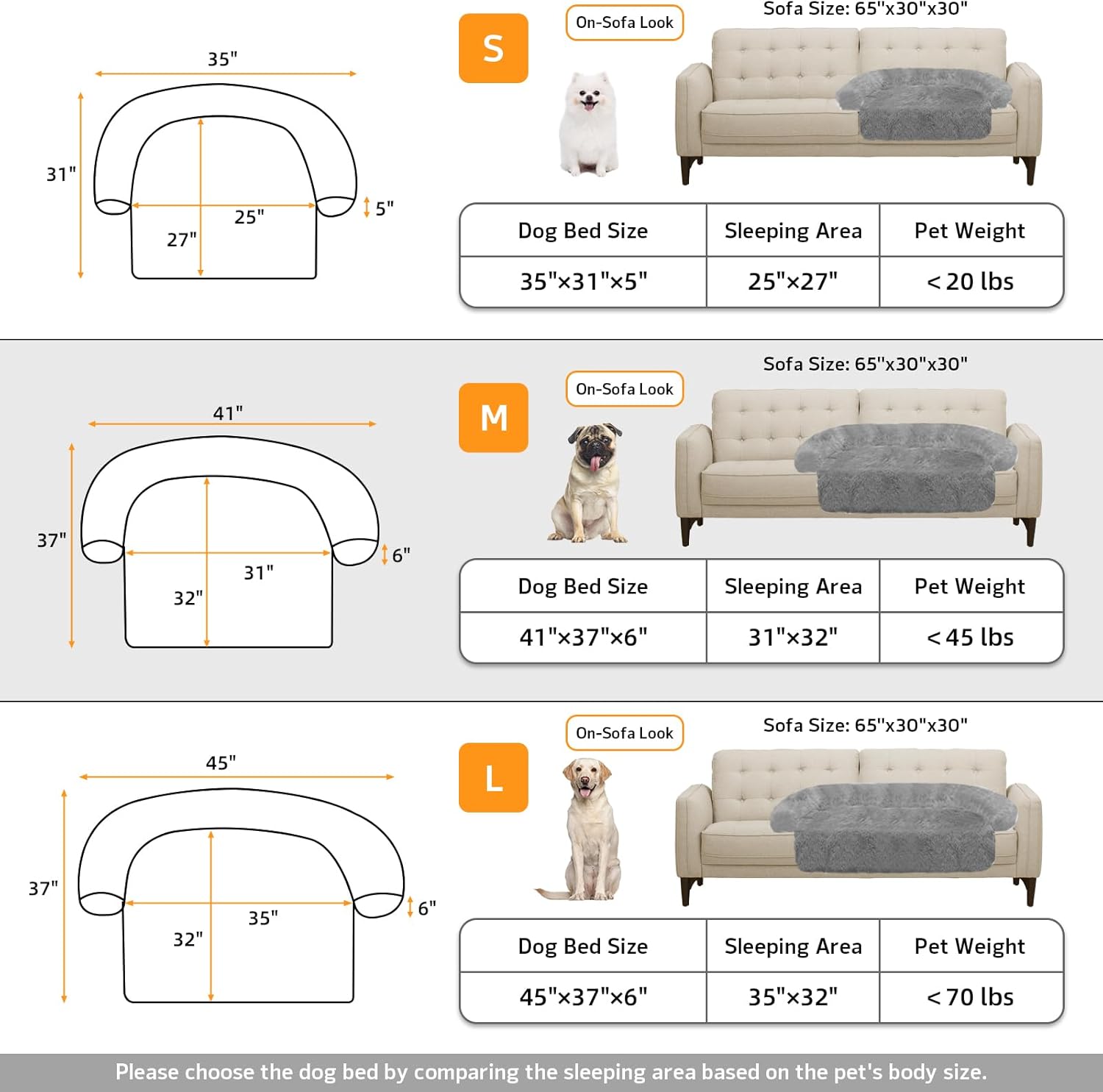 • 【Multiple Size Selection】The couch pet bed has 5 sizes for you to choose from. XS: 31"x23.5" dog bed for small pets. S: 35“x31" dog bed for cats and small dogs. M: 41”x37" dog bed for medium dogs. L: 45“x37" dog bed for large dogs. XL:53"x39" dog bed for large dogs. We have enlarged the sleeping area for pets to give dogs more space.