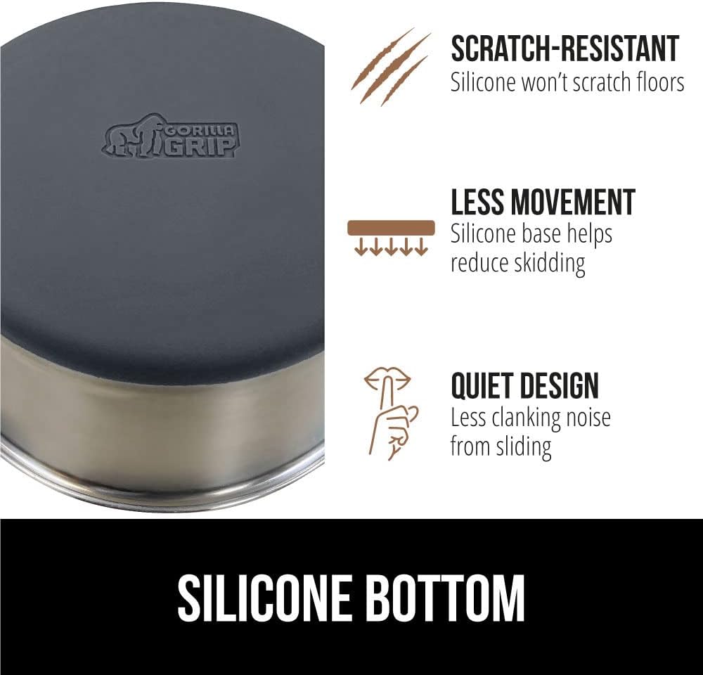 • SILICONE BOTTOM: the Gorilla Grip bowl is constructed from durable silicone that helps keep the bowl steady and won’t scratch your floors; while some over eager eaters may still be able to slide the bowls, the silicone will help prevent much movement; plus, it reduces the noise from clanking and sliding across wood, tile, and more