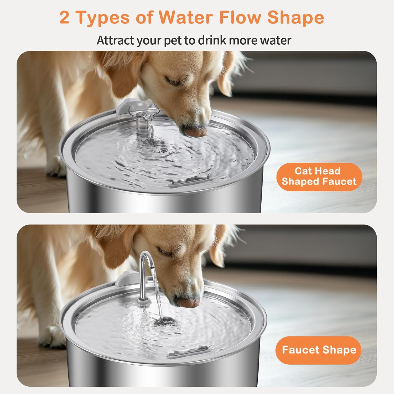 • Dual Faucet Design Dog Fountain Water Bowl: This water fountain for dogs features two faucet options, allowing you to choose the one your pet prefers. The dynamic water flow catches their attention and encourages them to drink more, supporting their overall health and hydration.