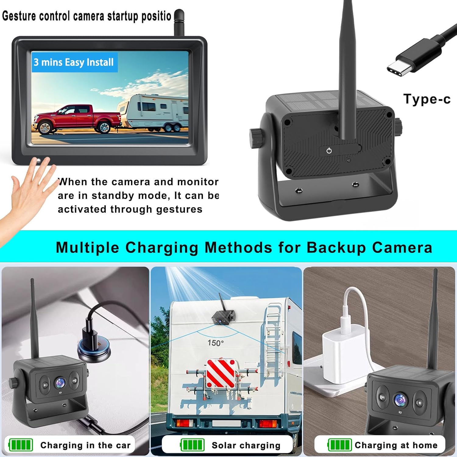 - Gesture control & Energy-Saving: The screen will automatically turn off when you don't need it. The car backup camera wireless will quickly enter the energy -saving sleep mode around 10s. You no longer need to manually turn off the rv camera power supply, which will reduce the charging frequency of trailer camera. it has a longer battery life, When the hand is within 4inch of the โGesture control camera startup positioโ, shake the hand 3 times to activate the display screen and camera.