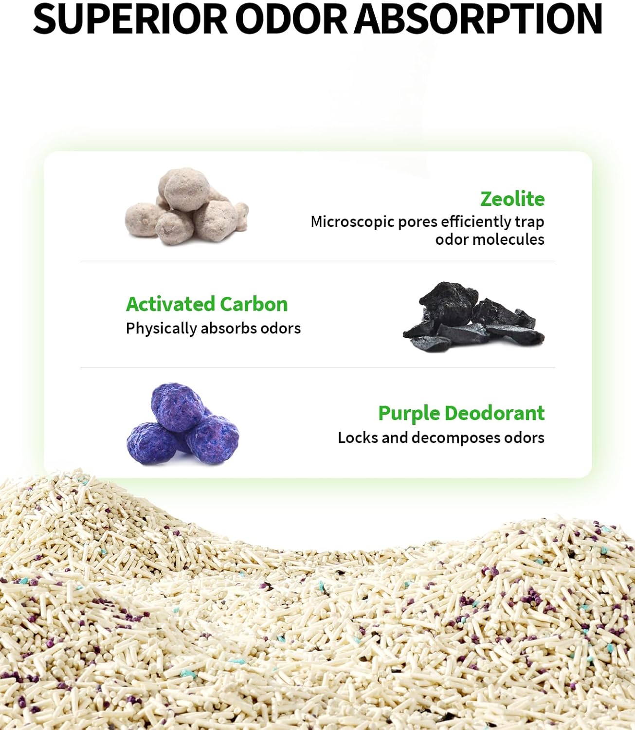 • EFFICIENT ODOR CONTROL: Activated carbon physically absorbs odor molecules, purple deodorant locks and decomposes odors. Zeolite has a unique crystalline structure filled with microscopic pores. These pores highly effectively trap odor molecules such as ammonia and hydrogen sulfide in cat waste, reducing the unpleasant smells in the litter box.
