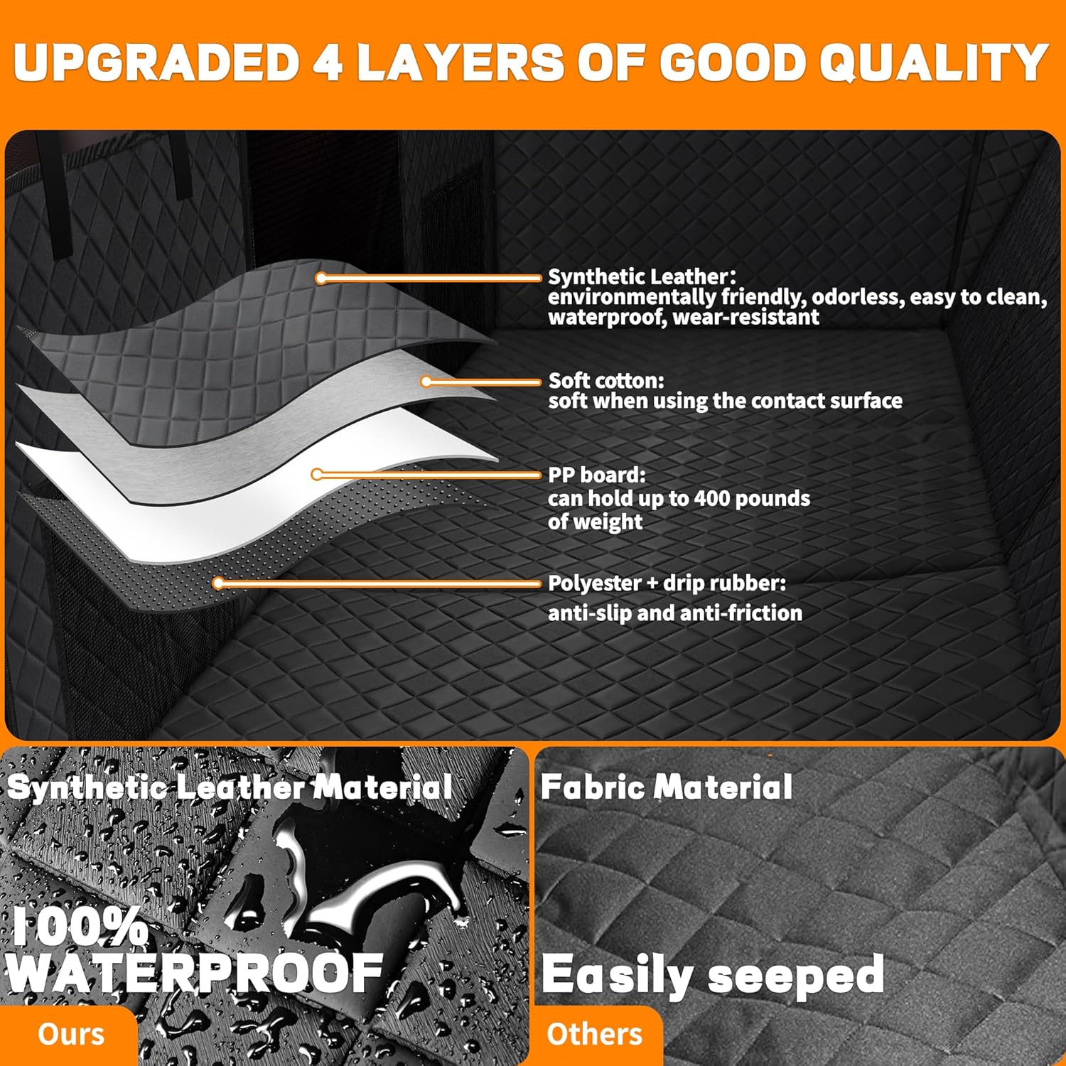 • WATERPROOF NON-SLIP MATERIAL:The rear seat extender is made of four high-quality materials. We have 3 PP hollow boards, which are soft and durable. The outside is a layer of Synthetic leather,which is odorless, shock-absorbing, and compounded with 5mm cotton. which has waterproof and anti slip effects.
