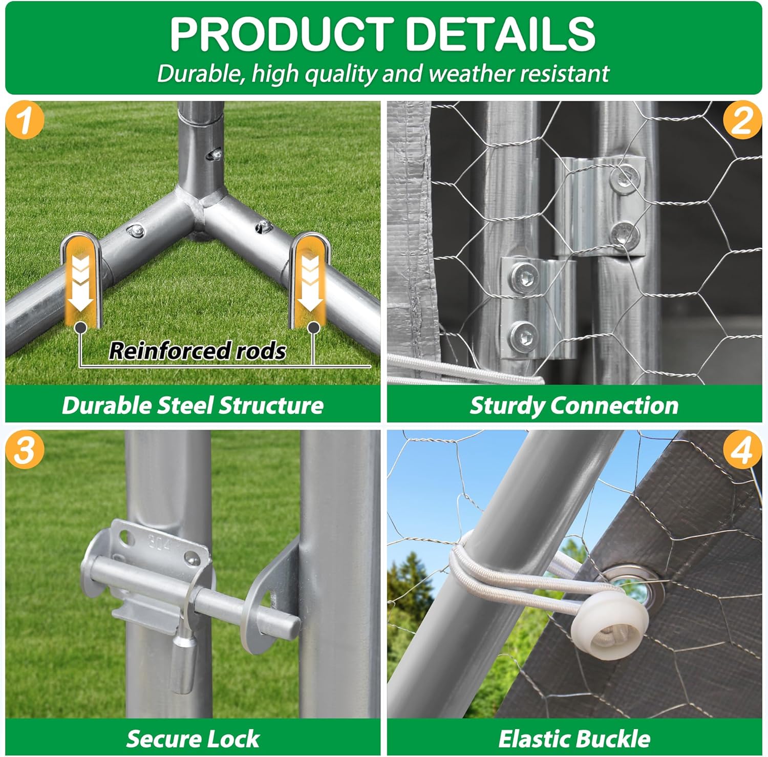 • 🐤MULTIPURPOSE USE: The metal chicken coop run is equipped with a lockable galvanized metal door, not only suitable for raising chickens, but also for raising other poultry such as ducks, rabbits, geese, etc.