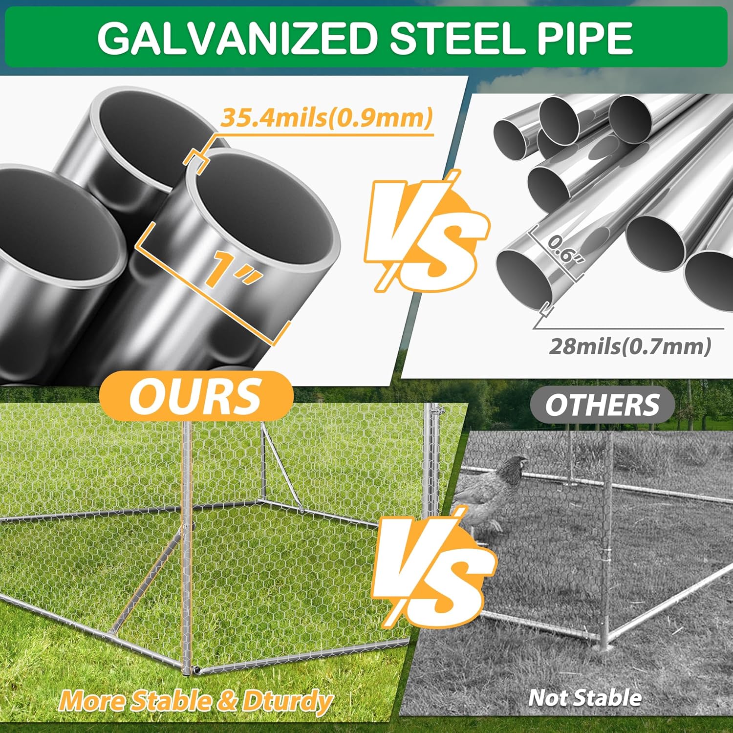 • 🐤STURDY& DURABLE: Our chicken coop is made of upgraded reinforced galvanized steel pipes with a thickness of 0.9 mm, which are strong, more durable and long-lasting than others(0.7 mm thick) .In addition, there are reinforced triangular support bars at the corners to enhance the stability of the chicken run.
